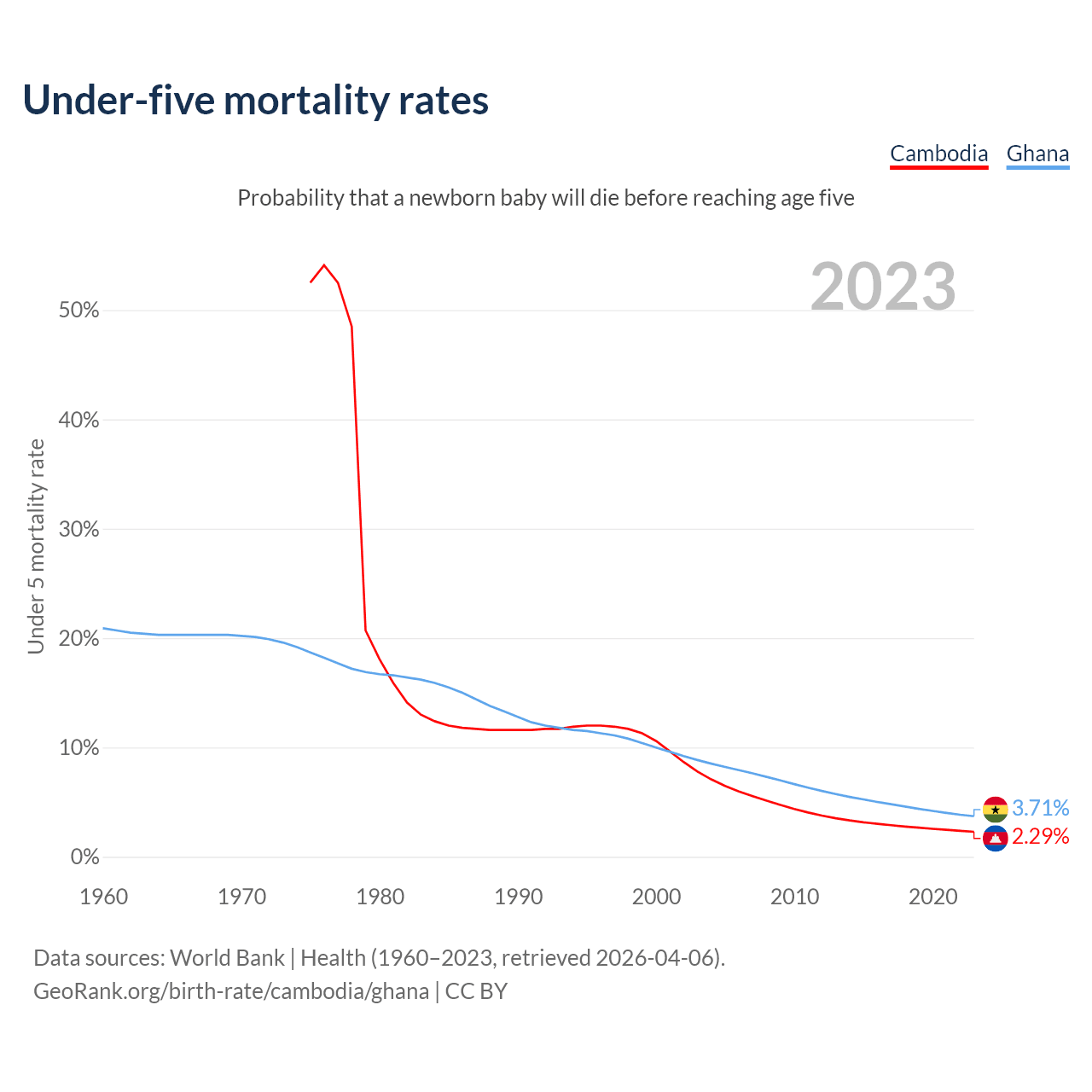 The chance that a newborn baby will die before reaching age five is 2.29% in Cambodia and 3.71% in Ghana. Above is a chart with historical data on under-five mortality rates.