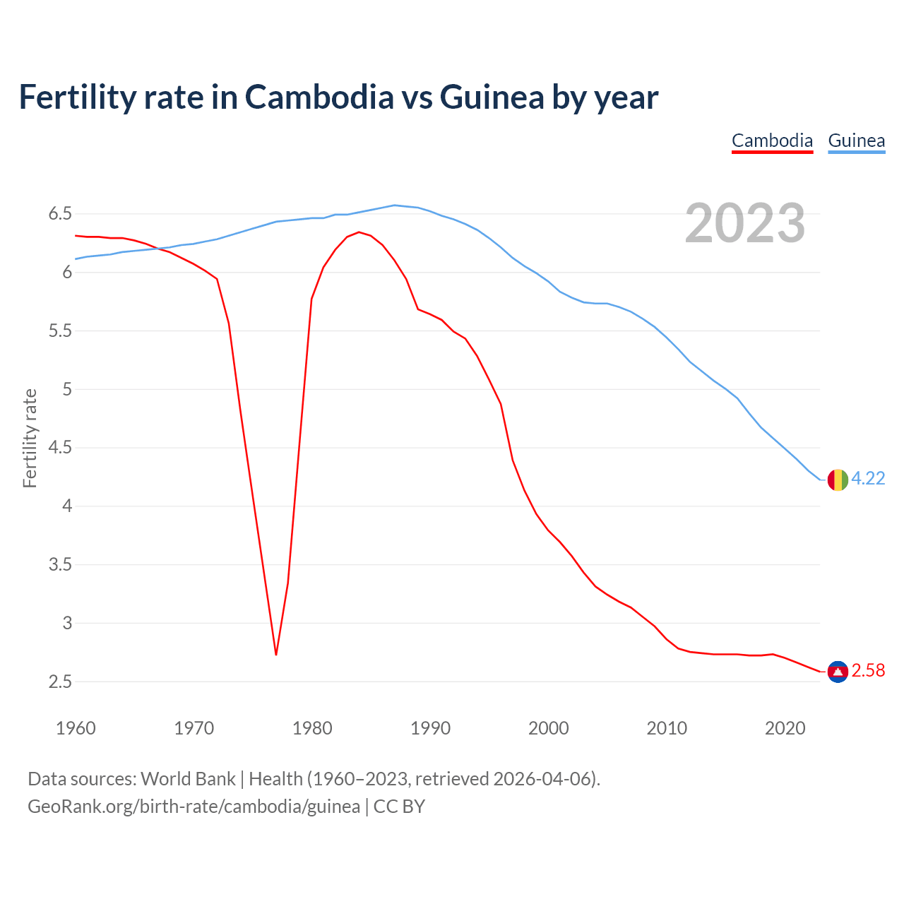 According to the latest available data on birth rates, the fertility rate in Cambodia was 2.58 children per woman in 2023, compared to 4.22 in Guinea in 2023. The replacement level is considered to be 2.1 children per woman.