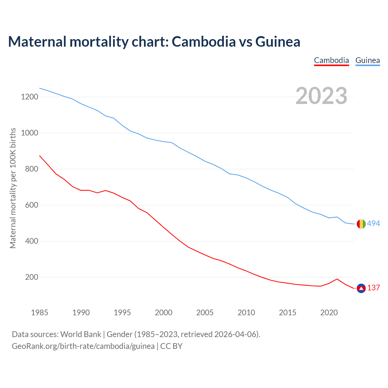 The maternal mortality rate, which is the probability of dying during childbirth or within 42 days of pregnancy termination, is 137 deaths per 100,000 live births in Cambodia, compared to 494 deaths in Guinea.