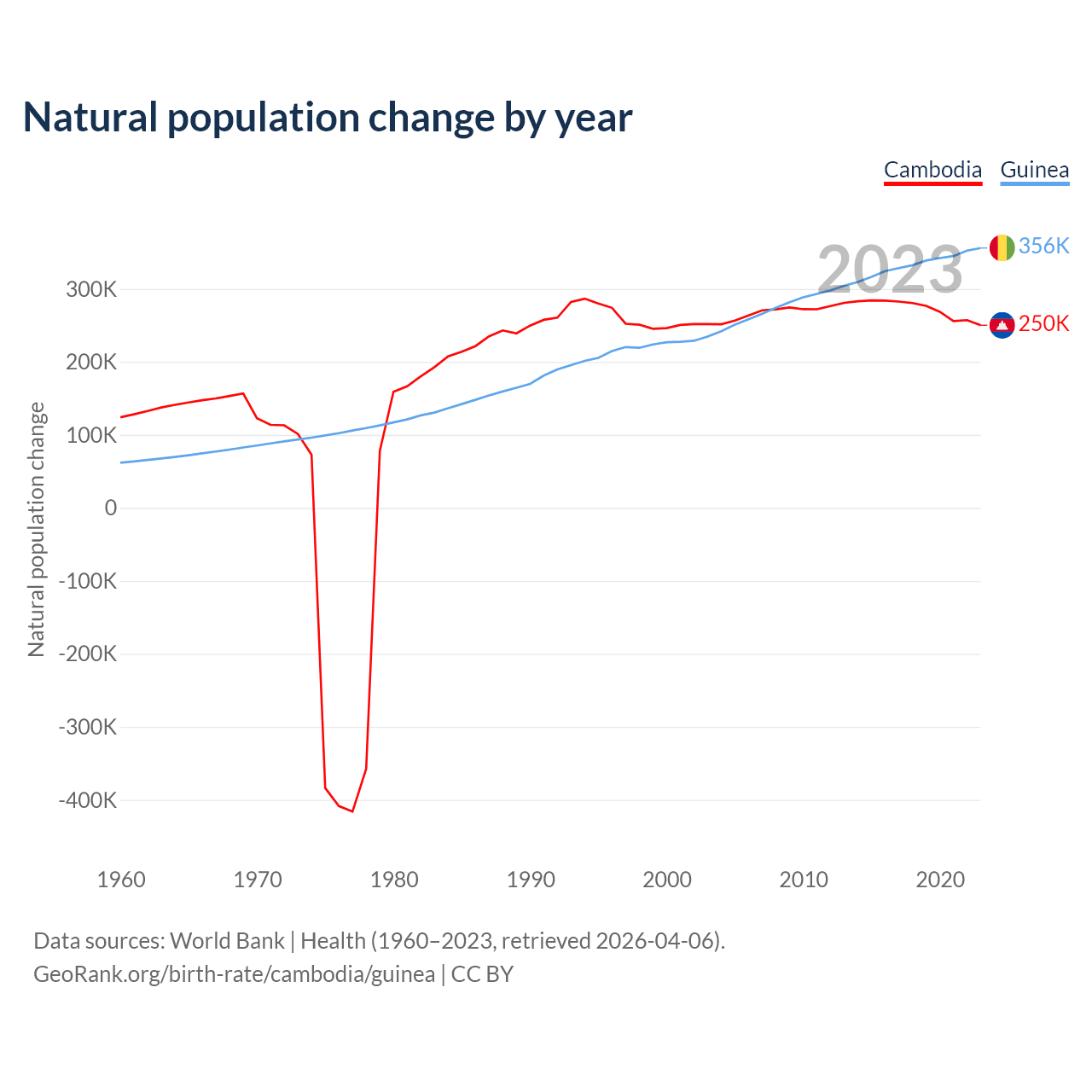 - Cambodia is ranked 71/196 by birth rate compared to 15/196 for Guinea.