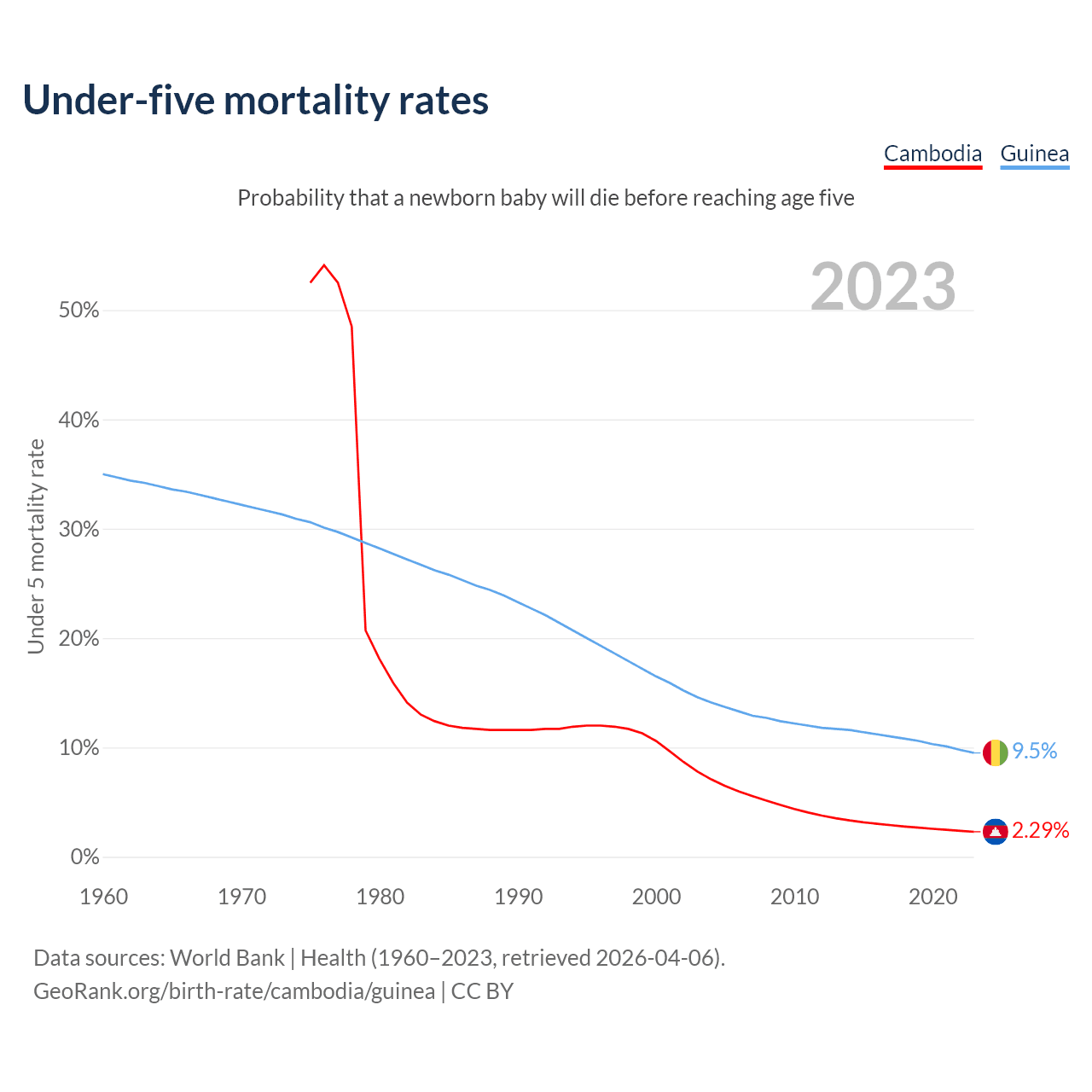 The chance that a newborn baby will die before reaching age five is 2.29% in Cambodia and 9.5% in Guinea. Above is a chart with historical data on under-five mortality rates.