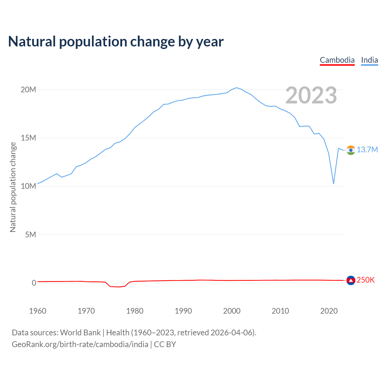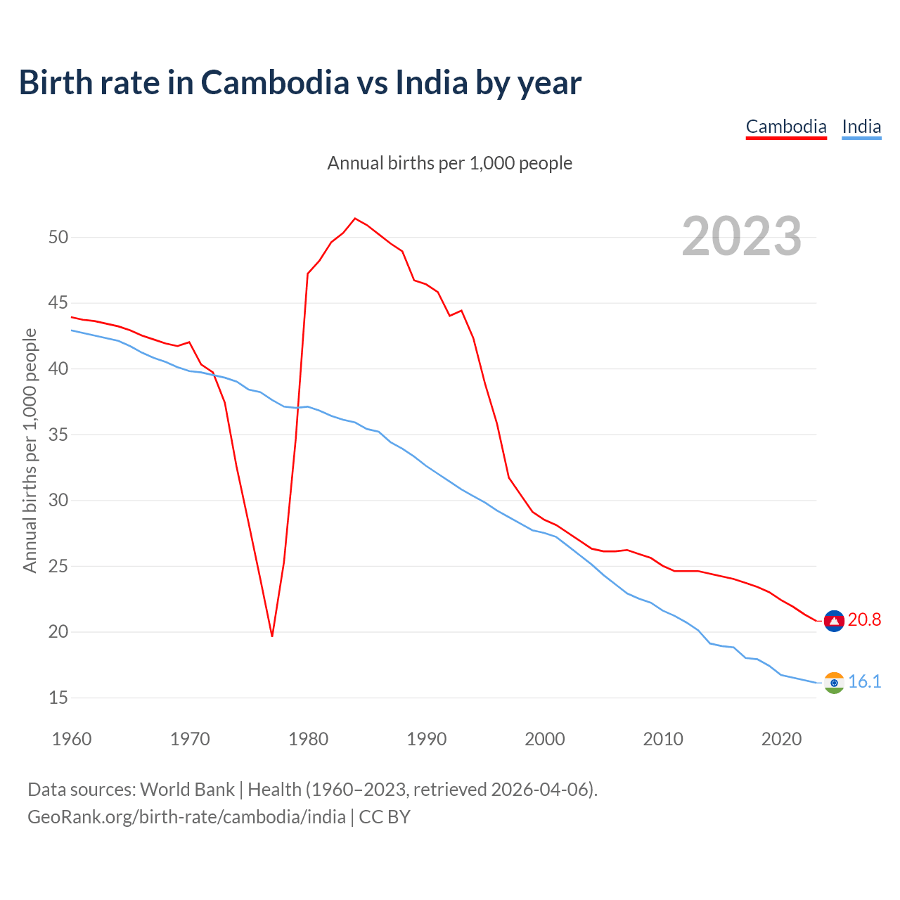 Cambodia has an annual birth rate of 20.8 births per 1,000 people, compared to 16.1 for India. The average number of children a woman is expected to have during her lifetime — the fertility rate, is 2.58 in Cambodia and 1.98 in India — 23.4% difference.