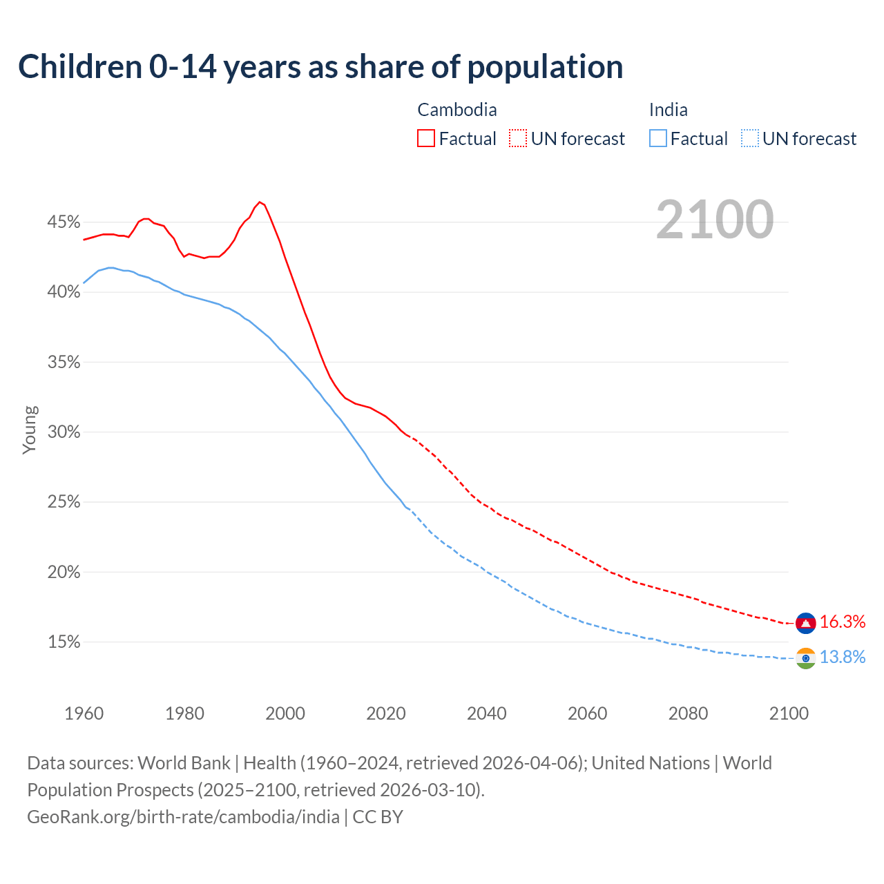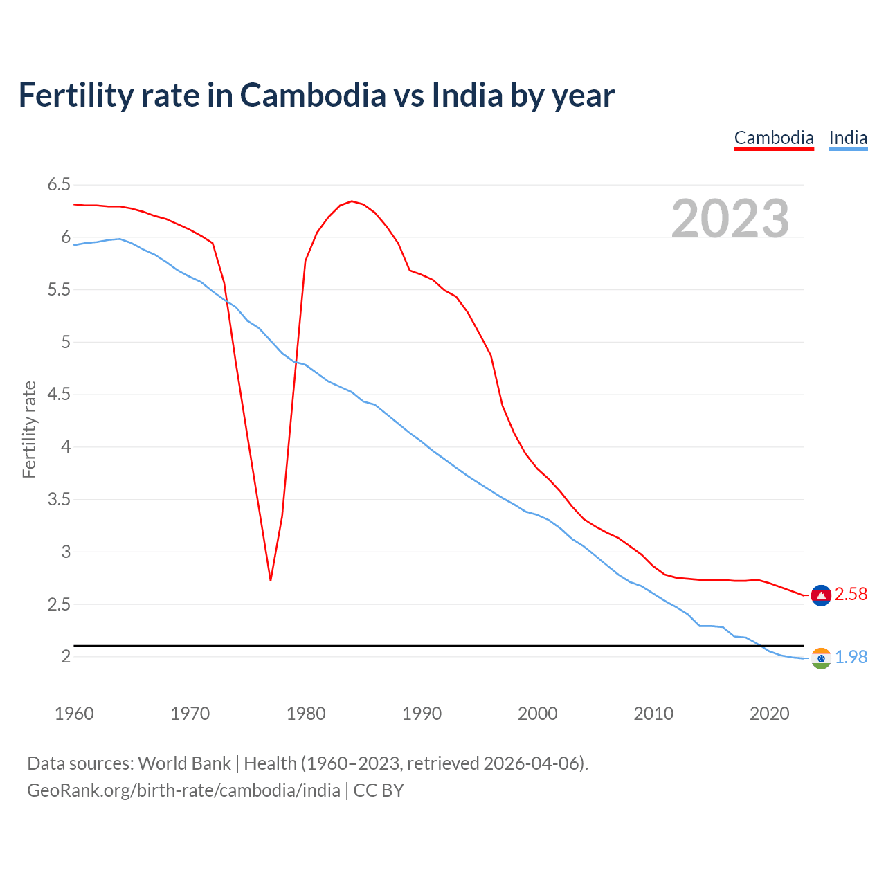 According to the latest available data on birth rates, the fertility rate in Cambodia was 2.58 children per woman in 2023, compared to 1.98 in India in 2023. The replacement level is considered to be 2.1 children per woman.