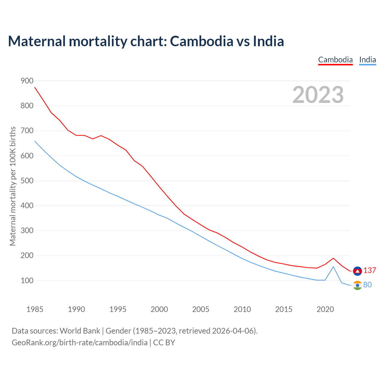 The maternal mortality rate, which is the probability of dying during childbirth or within 42 days of pregnancy termination, is 137 deaths per 100,000 live births in Cambodia, compared to 80 deaths in India.