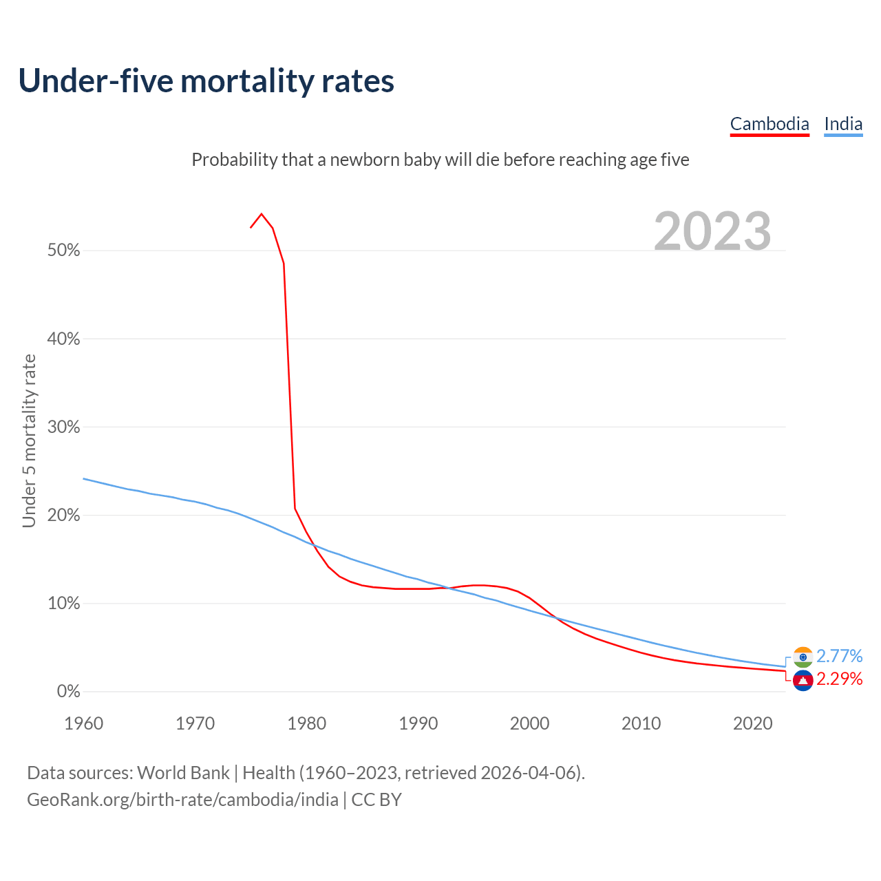 The chance that a newborn baby will die before reaching age five is 2.29% in Cambodia and 2.77% in India. Above is a chart with historical data on under-five mortality rates.