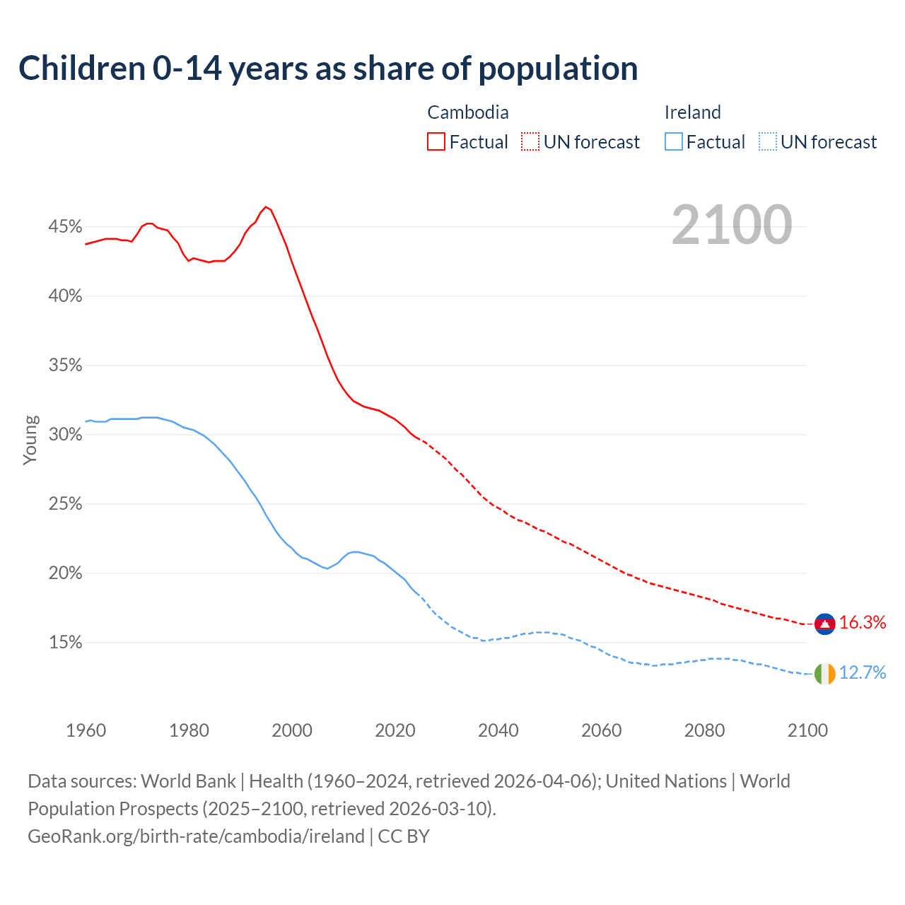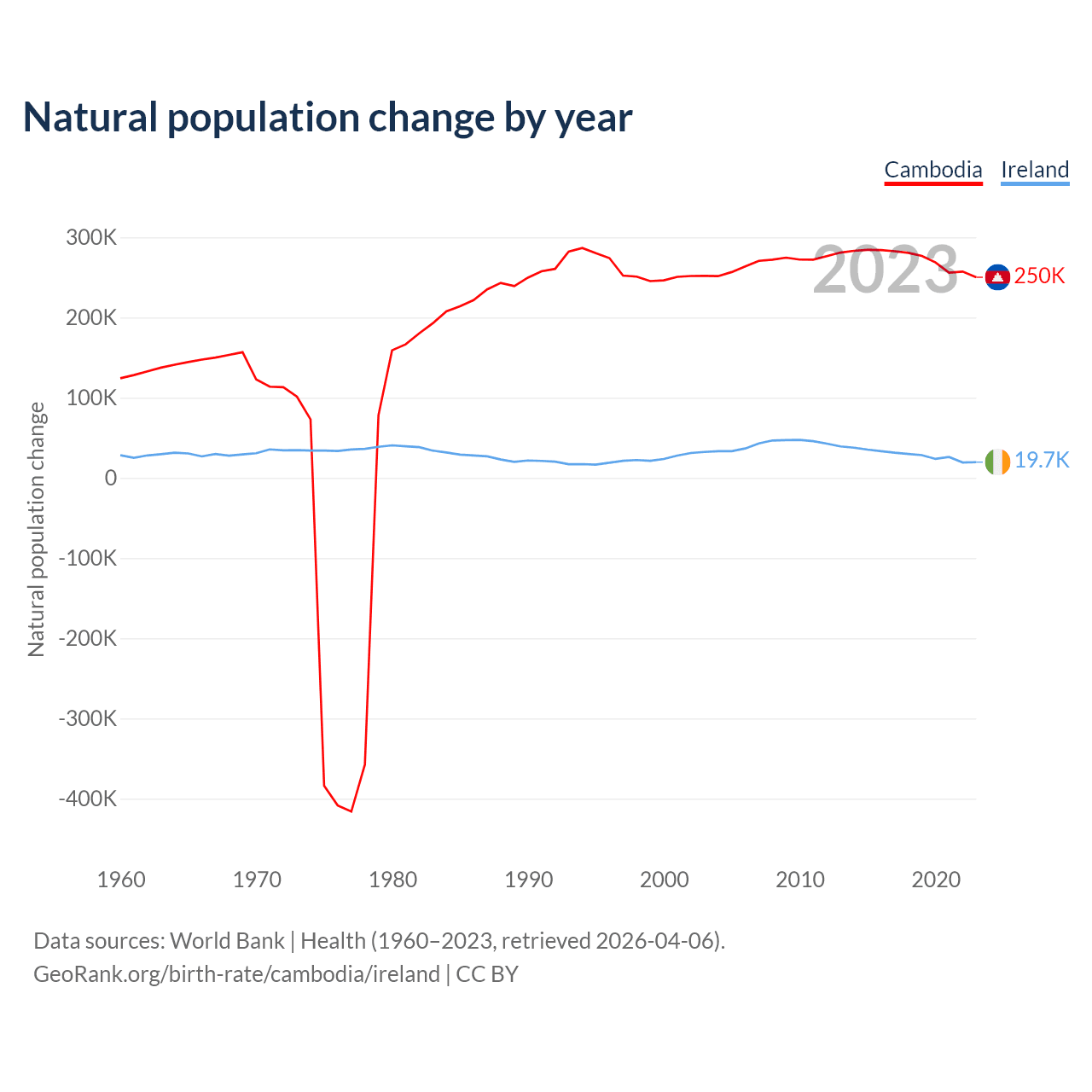 Cambodia has an annual birth rate of 20.8 births per 1,000 people, compared to 10.3 for Ireland. The average number of children a woman is expected to have during her lifetime — the fertility rate, is 2.58 in Cambodia and 1.5 in Ireland — 41.8% difference.