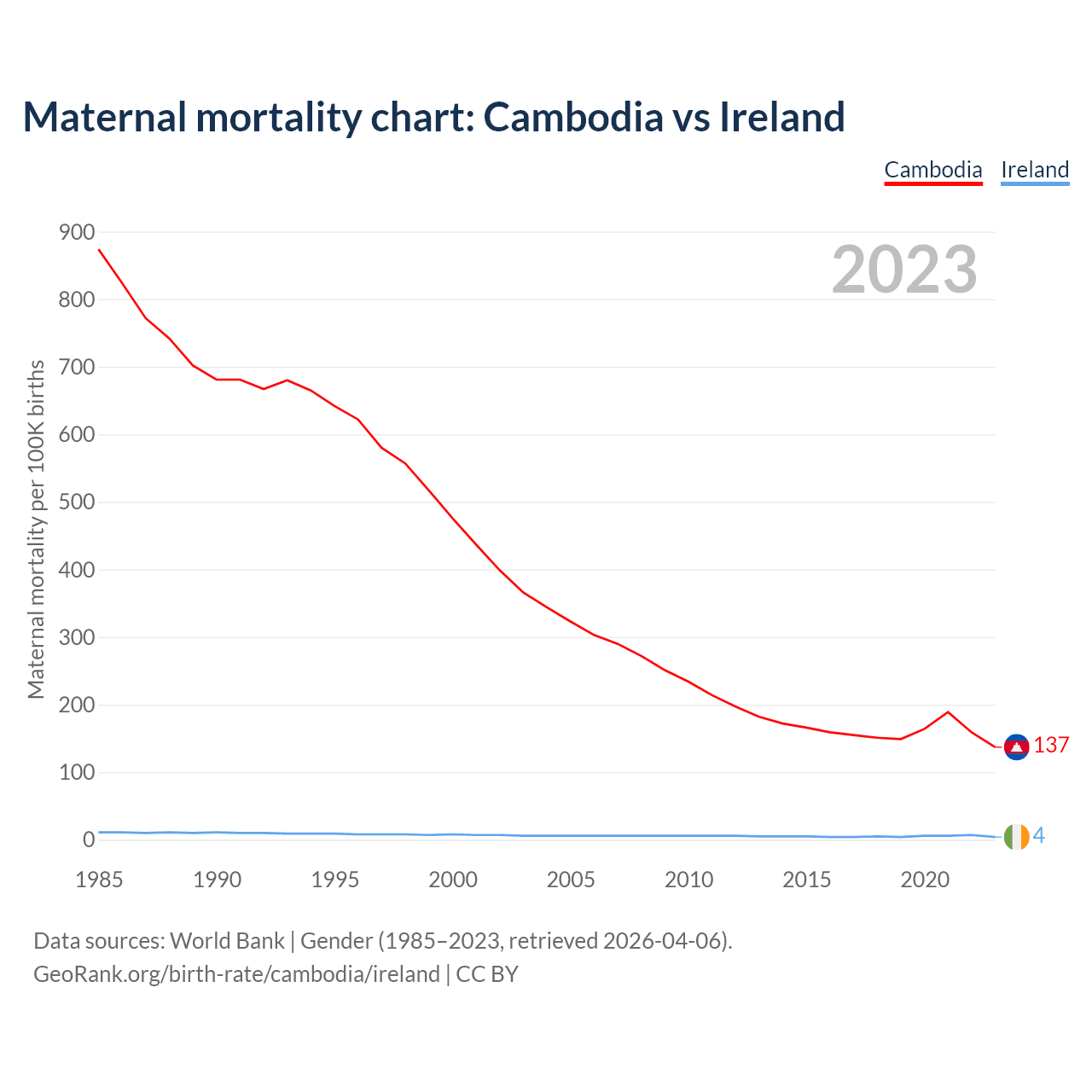 The maternal mortality rate, which is the probability of dying during childbirth or within 42 days of pregnancy termination, is 137 deaths per 100,000 live births in Cambodia, compared to 4 deaths in Ireland.