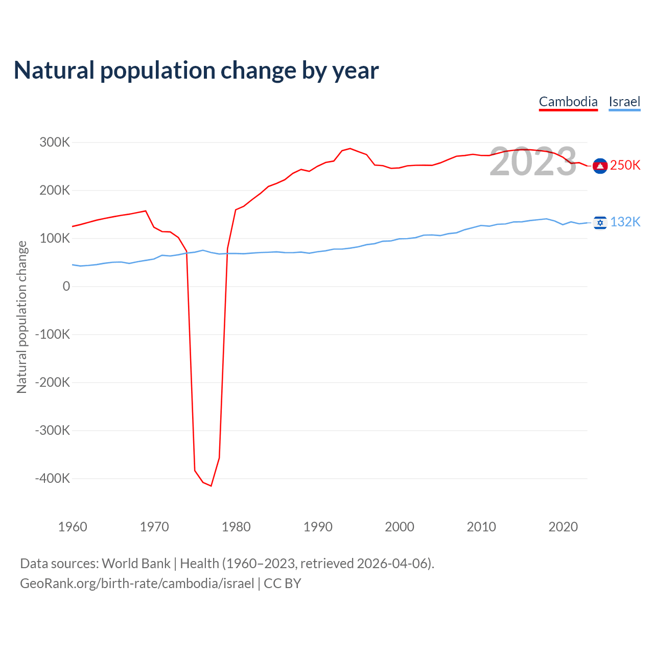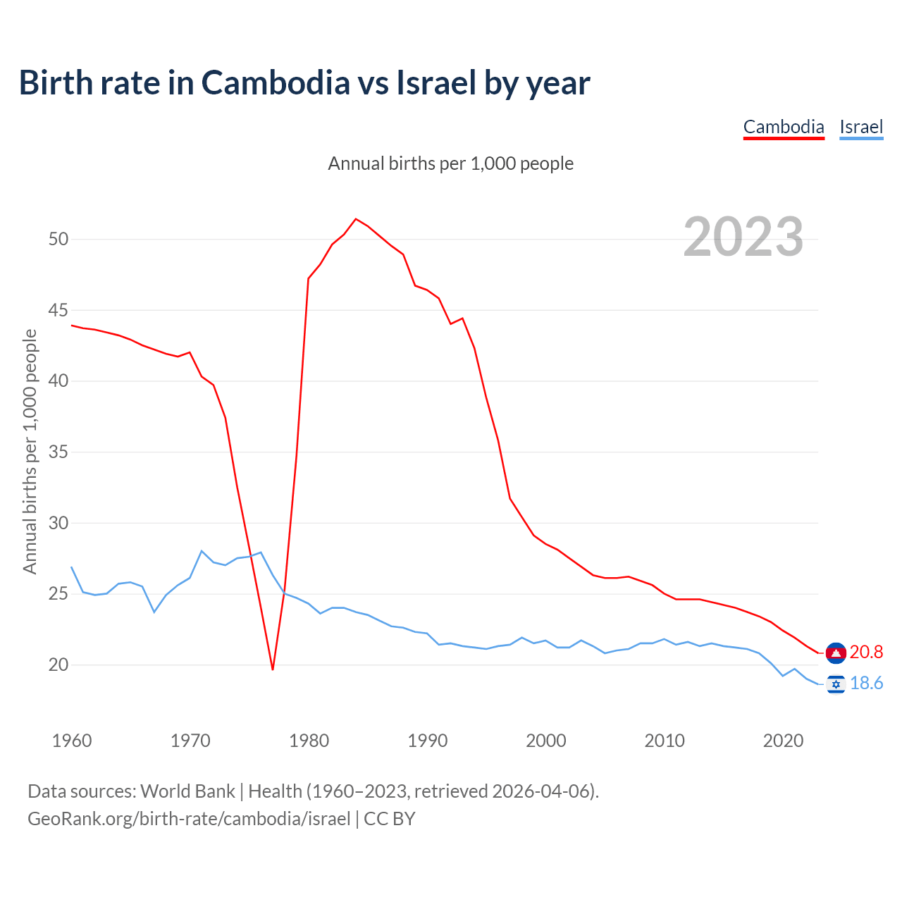 Cambodia has an annual birth rate of 20.8 births per 1,000 people, compared to 18.6 for Israel. The average number of children a woman is expected to have during her lifetime — the fertility rate, is 2.58 in Cambodia and 2.85 in Israel — 10.5% difference.