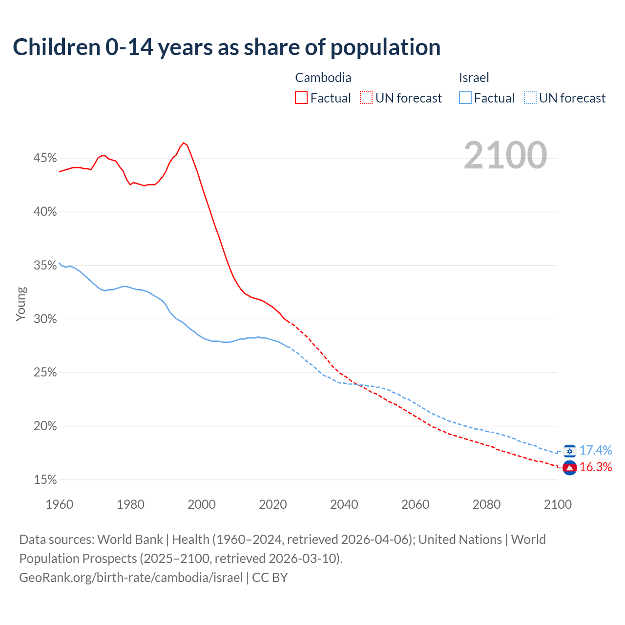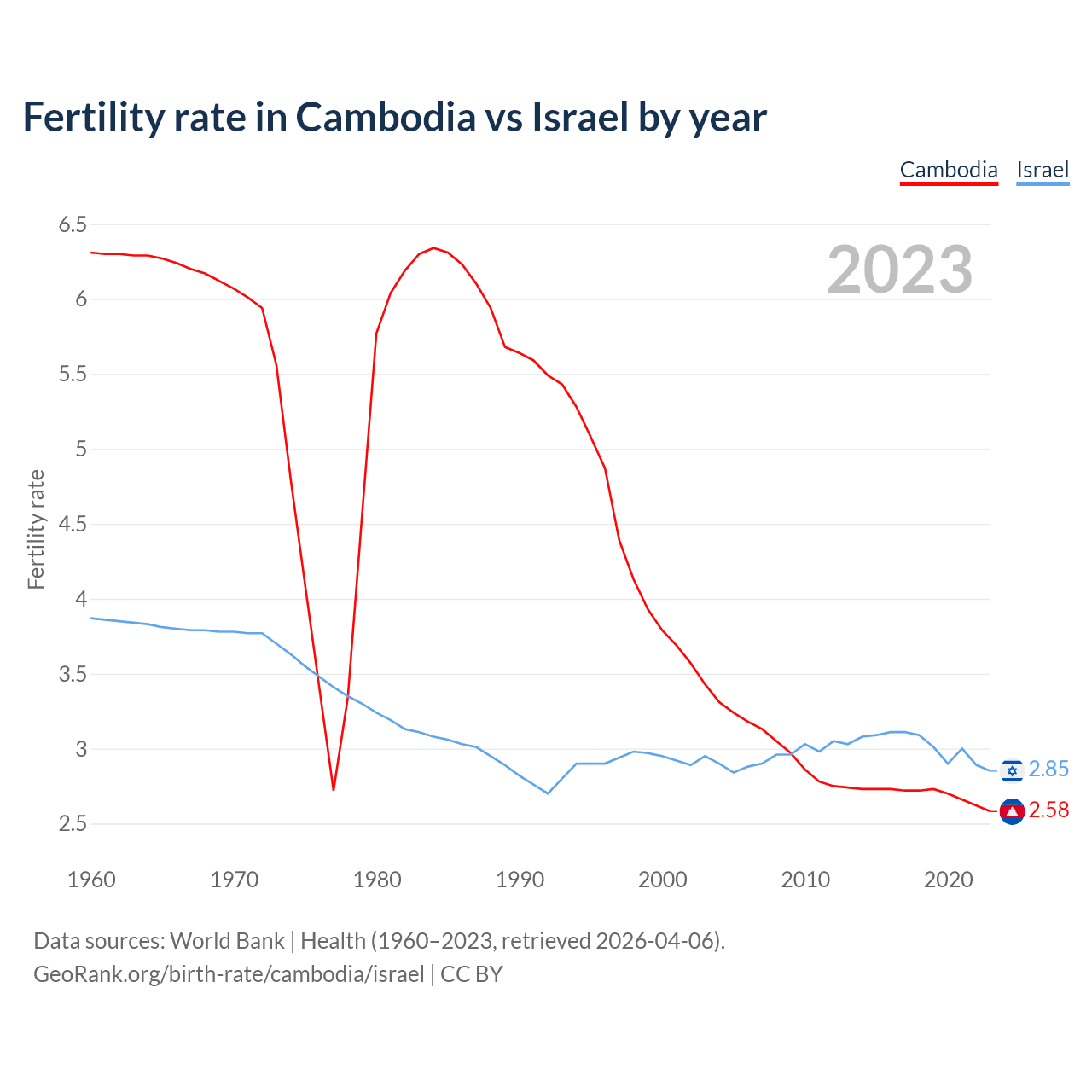 According to the latest available data on birth rates, the fertility rate in Cambodia was 2.58 children per woman in 2023, compared to 2.85 in Israel in 2023. The replacement level is considered to be 2.1 children per woman.