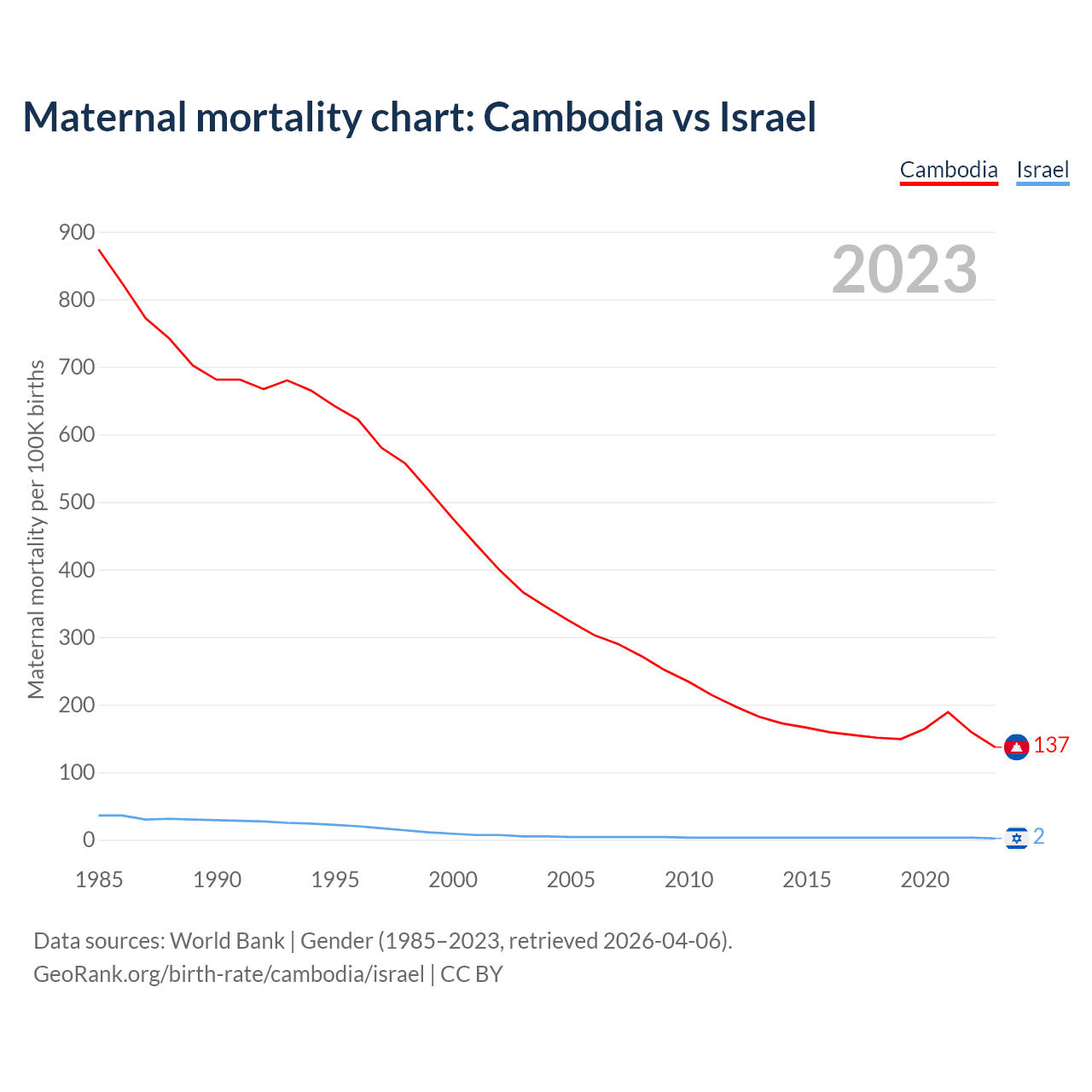 - Annual births per 1,000 women ages 15-19 (adolescent birth rate or teenage mother rate) is 46.9 in Cambodia vs 6.2 in Israel.
