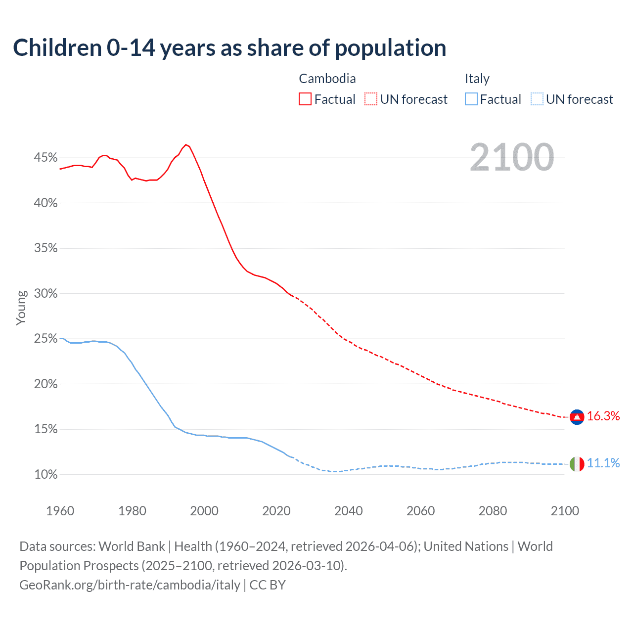 Cambodia has an annual birth rate of 20.8 births per 1,000 people, compared to 6.4 for Italy. The average number of children a woman is expected to have during her lifetime — the fertility rate, is 2.58 in Cambodia and 1.2 in Italy — 53.5% difference.