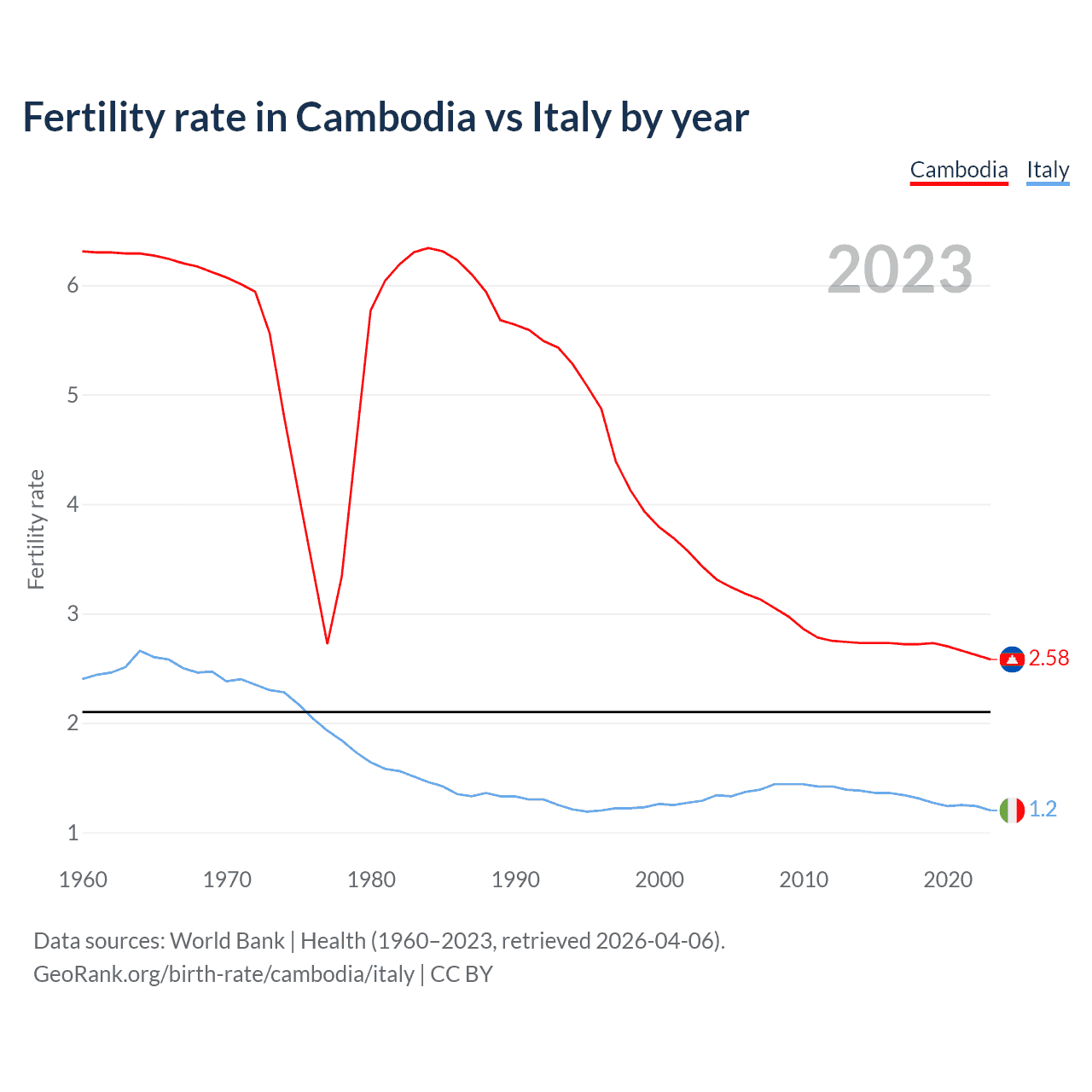 According to the latest available data on birth rates, the fertility rate in Cambodia was 2.58 children per woman in 2023, compared to 1.2 in Italy in 2023. The replacement level is considered to be 2.1 children per woman.