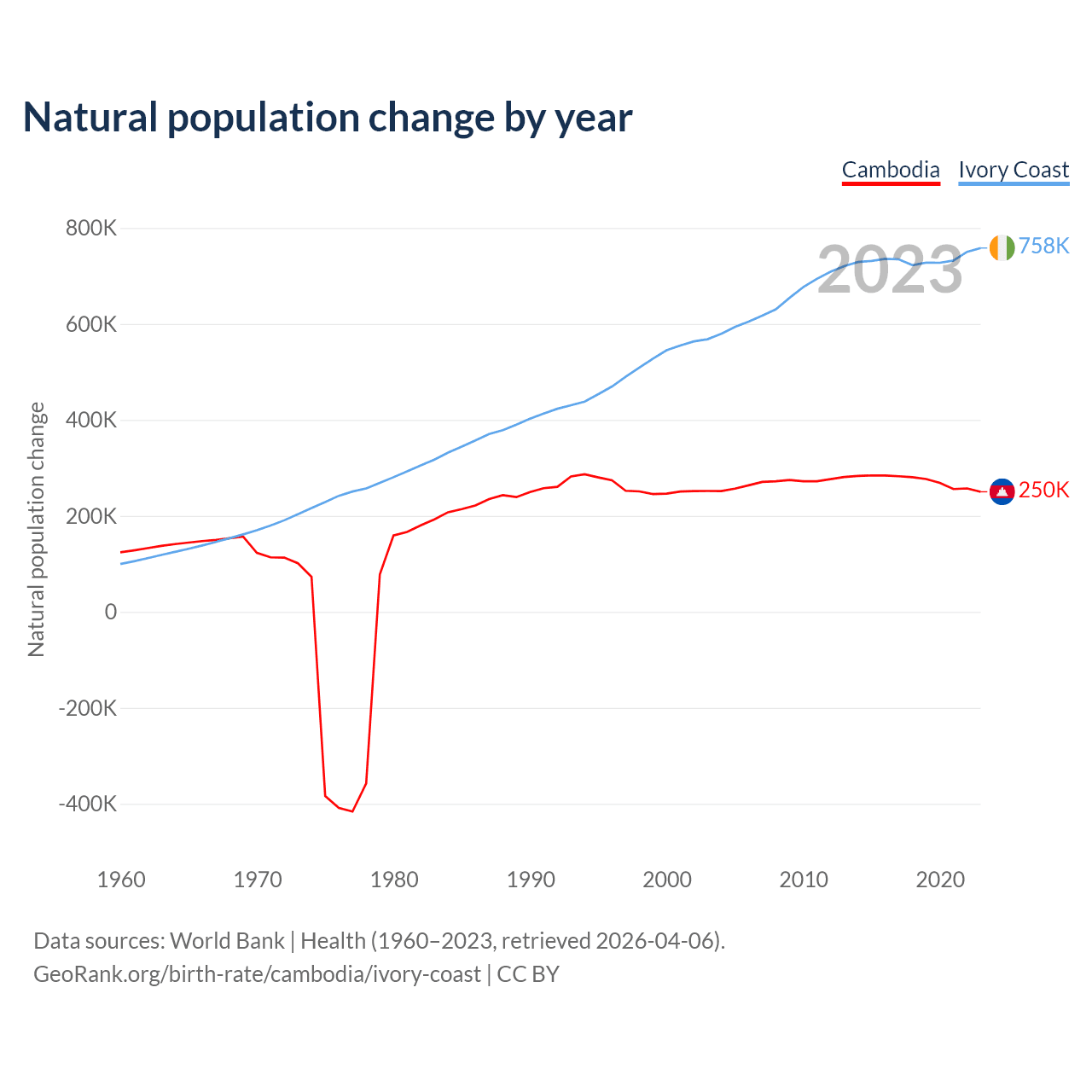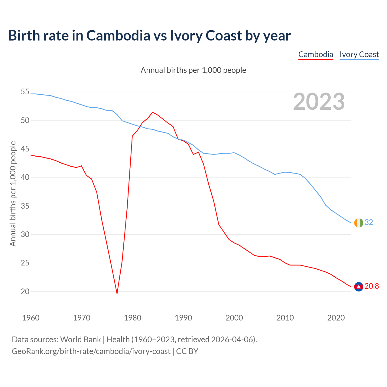 Cambodia has an annual birth rate of 20.8 births per 1,000 people, compared to 32 for Ivory Coast. The average number of children a woman is expected to have during her lifetime — the fertility rate, is 2.58 in Cambodia and 4.28 in Ivory Coast — 66.1% difference.