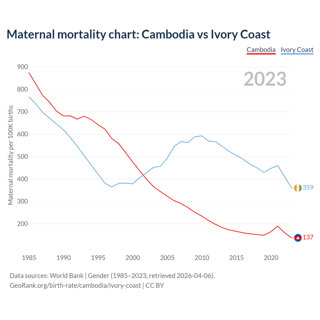 The maternal mortality rate, which is the probability of dying during childbirth or within 42 days of pregnancy termination, is 137 deaths per 100,000 live births in Cambodia, compared to 359 deaths in Ivory Coast.