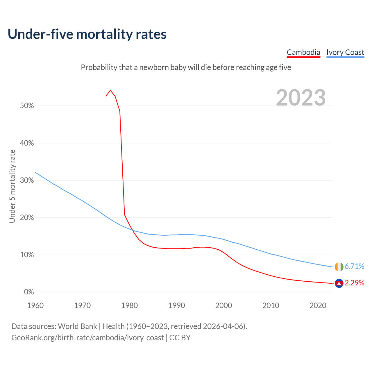 The chance that a newborn baby will die before reaching age five is 2.29% in Cambodia and 6.71% in Ivory Coast. Above is a chart with historical data on under-five mortality rates.