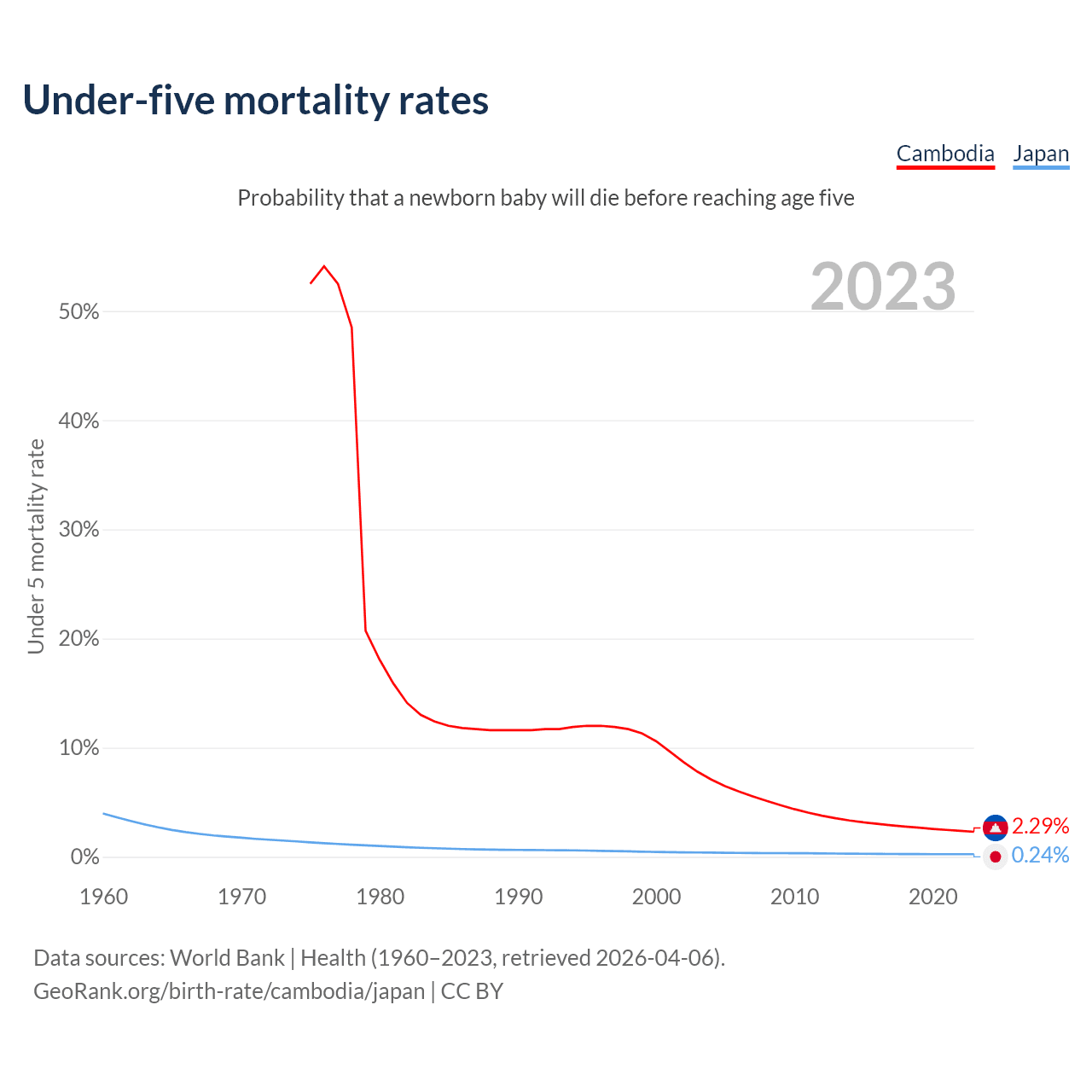 The chance that a newborn baby will die before reaching age five is 2.29% in Cambodia and 0.24% in Japan. Above is a chart with historical data on under-five mortality rates.
