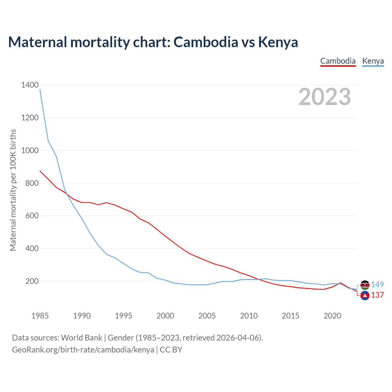 The maternal mortality rate, which is the probability of dying during childbirth or within 42 days of pregnancy termination, is 137 deaths per 100,000 live births in Cambodia, compared to 149 deaths in Kenya.