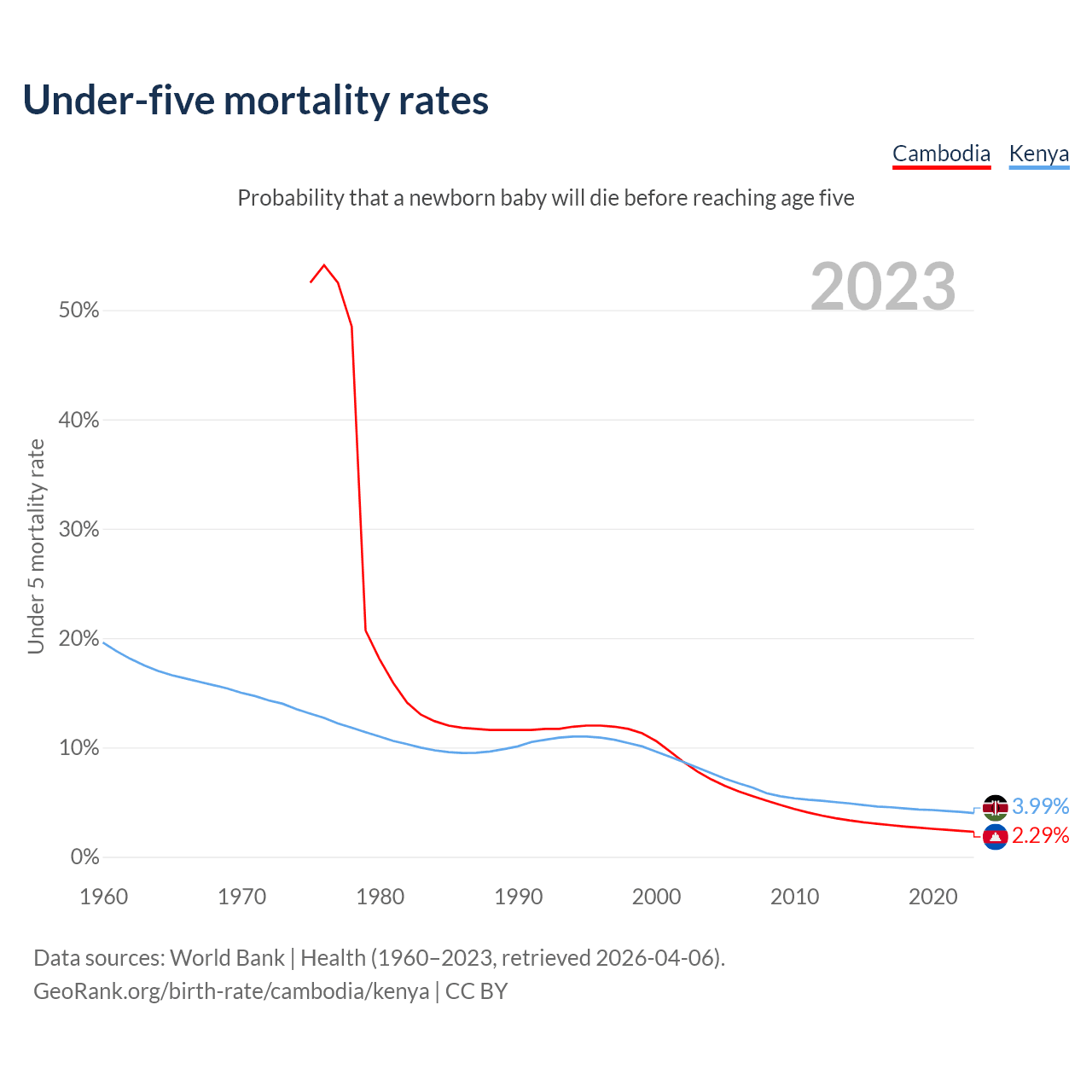 The chance that a newborn baby will die before reaching age five is 2.29% in Cambodia and 3.99% in Kenya. Above is a chart with historical data on under-five mortality rates.