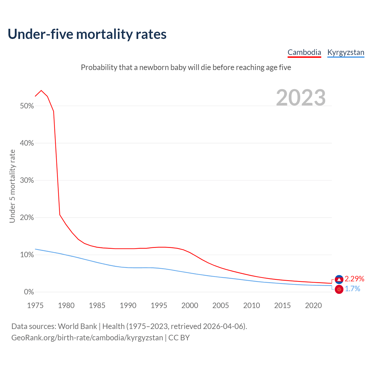The chance that a newborn baby will die before reaching age five is 2.29% in Cambodia and 1.7% in Kyrgyzstan. Above is a chart with historical data on under-five mortality rates.