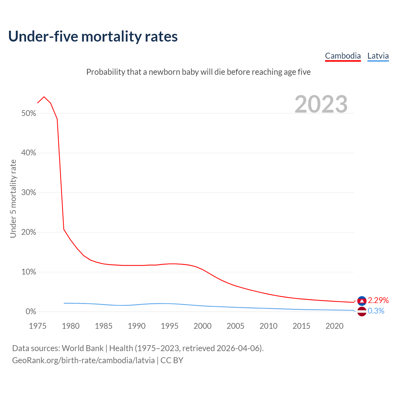 The chance that a newborn baby will die before reaching age five is 2.29% in Cambodia and 0.3% in Latvia. Above is a chart with historical data on under-five mortality rates.