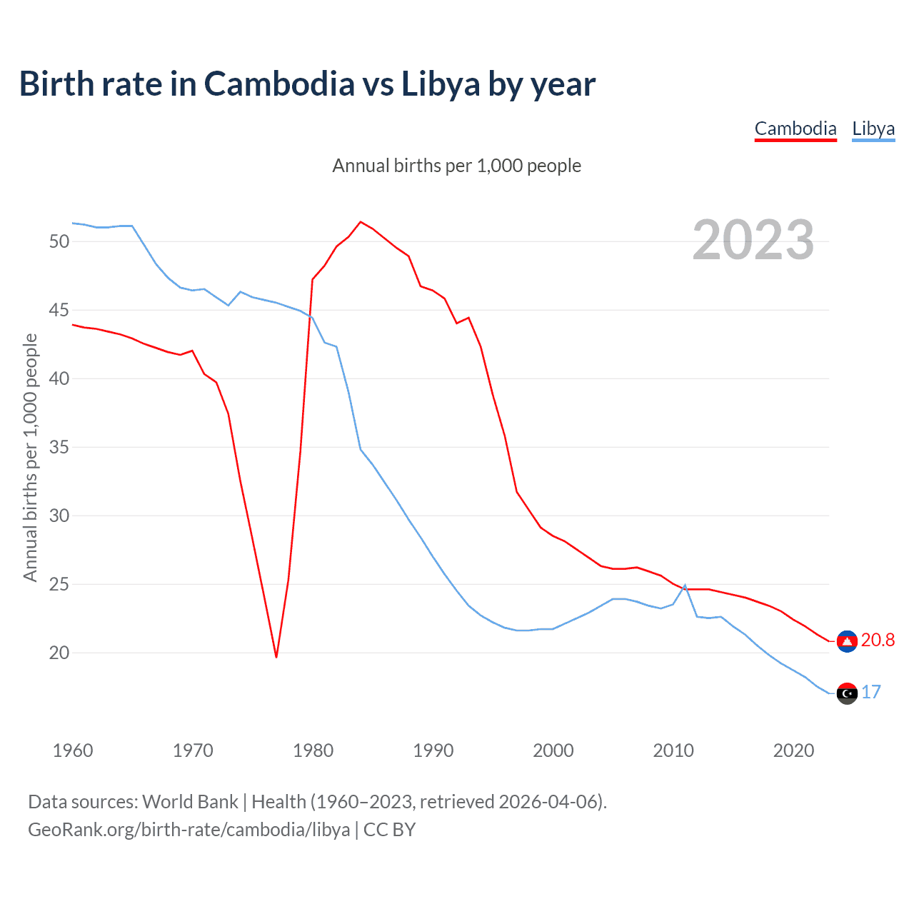 Cambodia has an annual birth rate of 20.8 births per 1,000 people, compared to 17 for Libya. The average number of children a woman is expected to have during her lifetime — the fertility rate, is 2.58 in Cambodia and 2.36 in Libya — 8.69% difference.