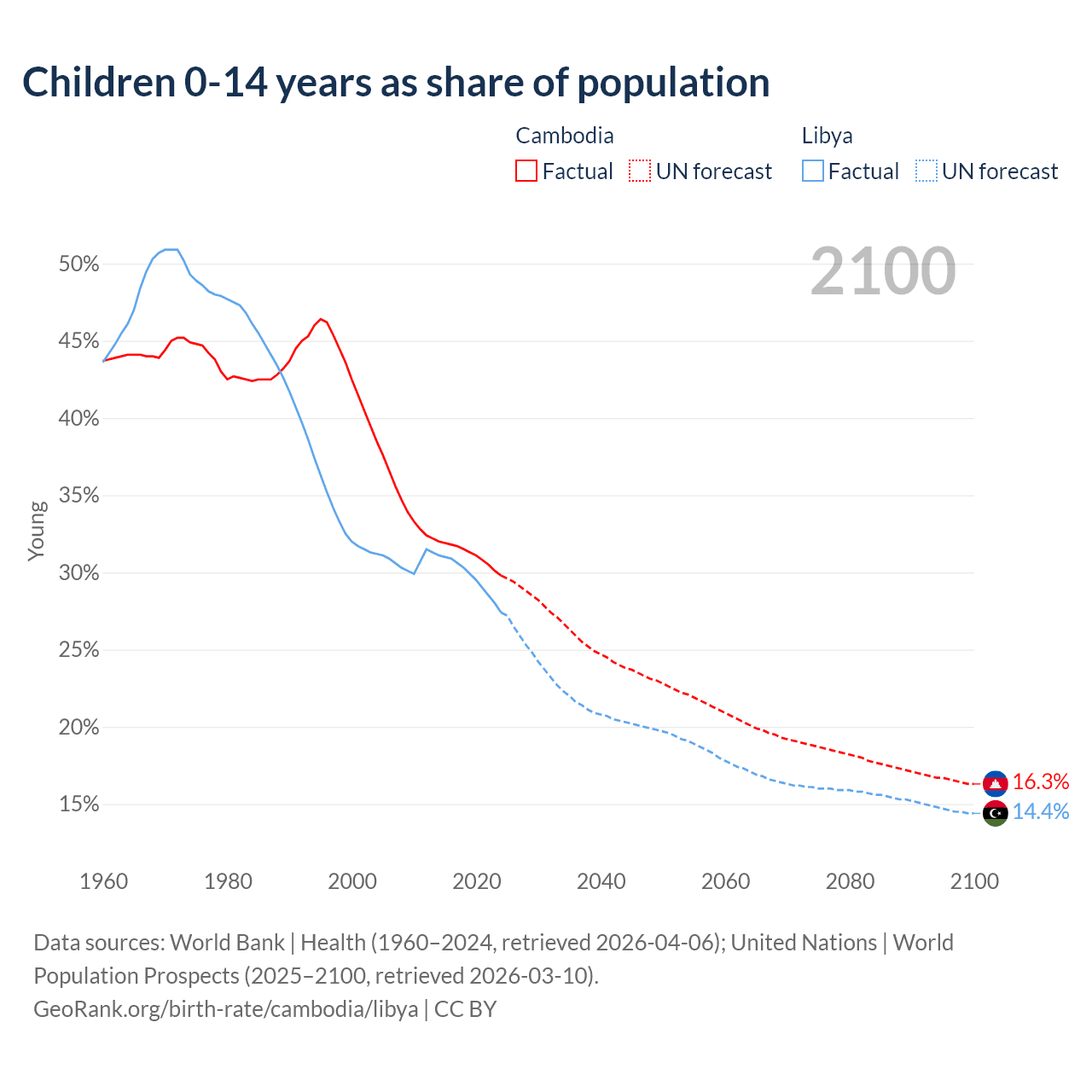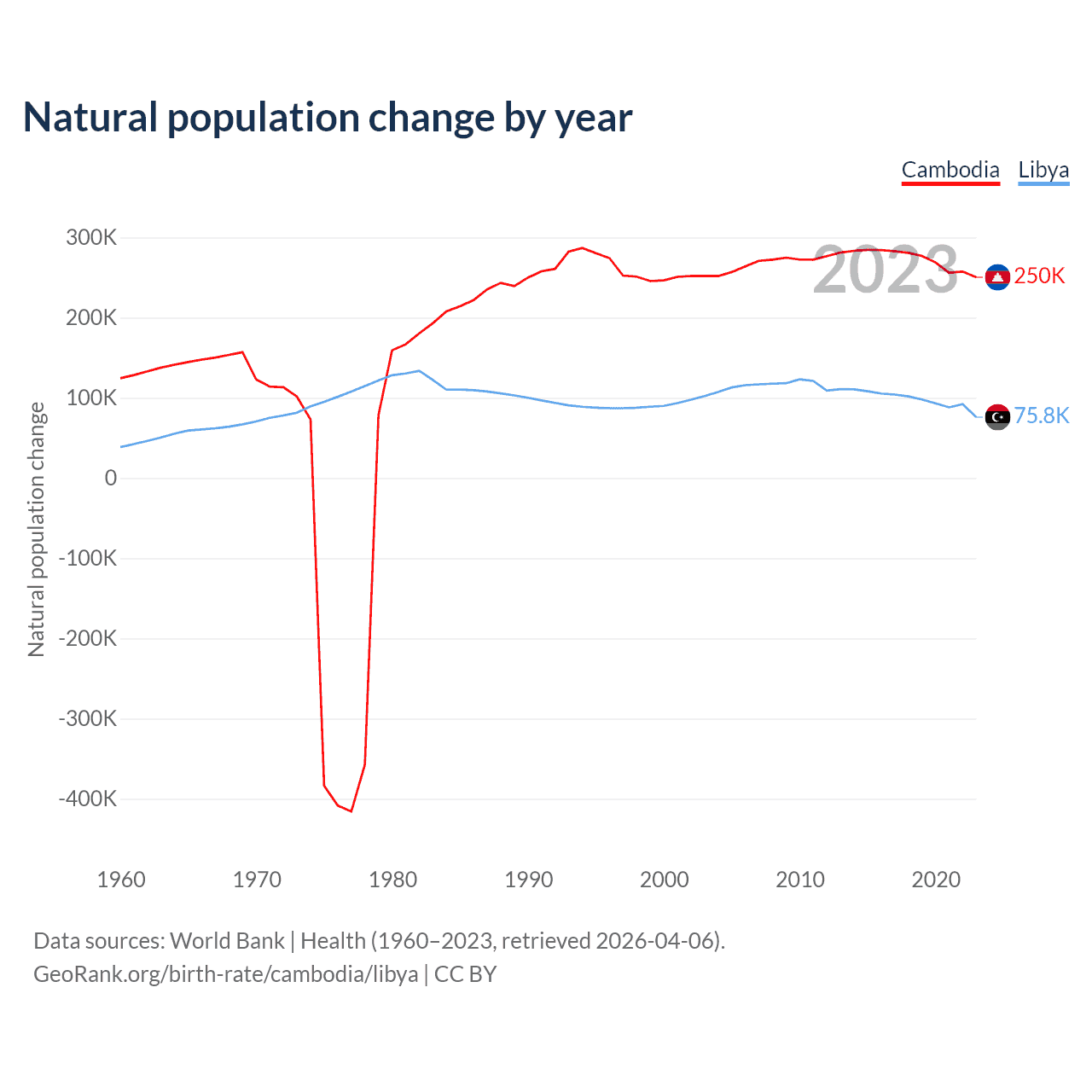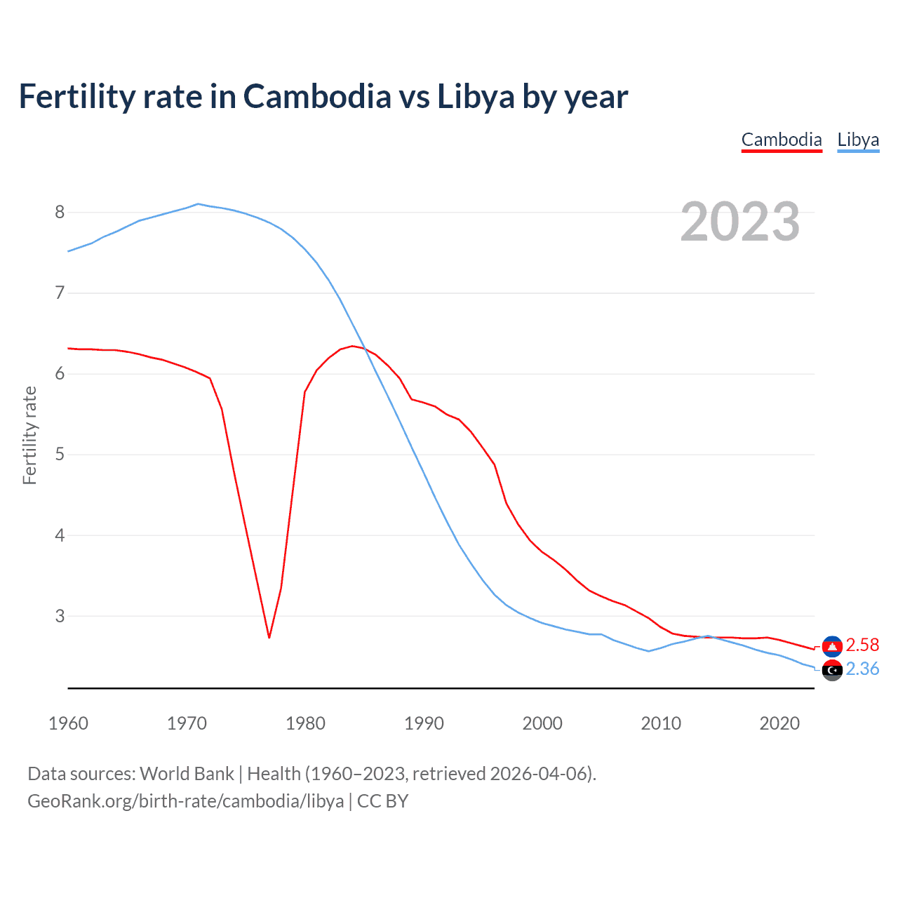 According to the latest available data on birth rates, the fertility rate in Cambodia was 2.58 children per woman in 2023, compared to 2.36 in Libya in 2023. The replacement level is considered to be 2.1 children per woman.