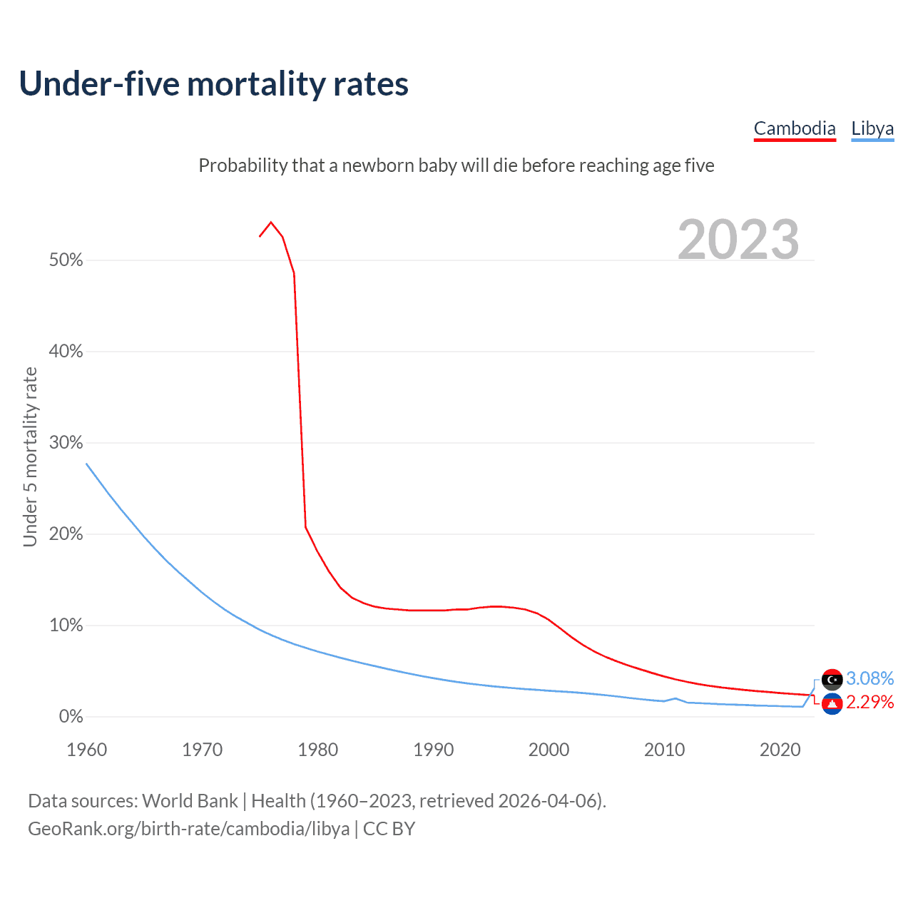 The chance that a newborn baby will die before reaching age five is 2.29% in Cambodia and 3.08% in Libya. Above is a chart with historical data on under-five mortality rates.