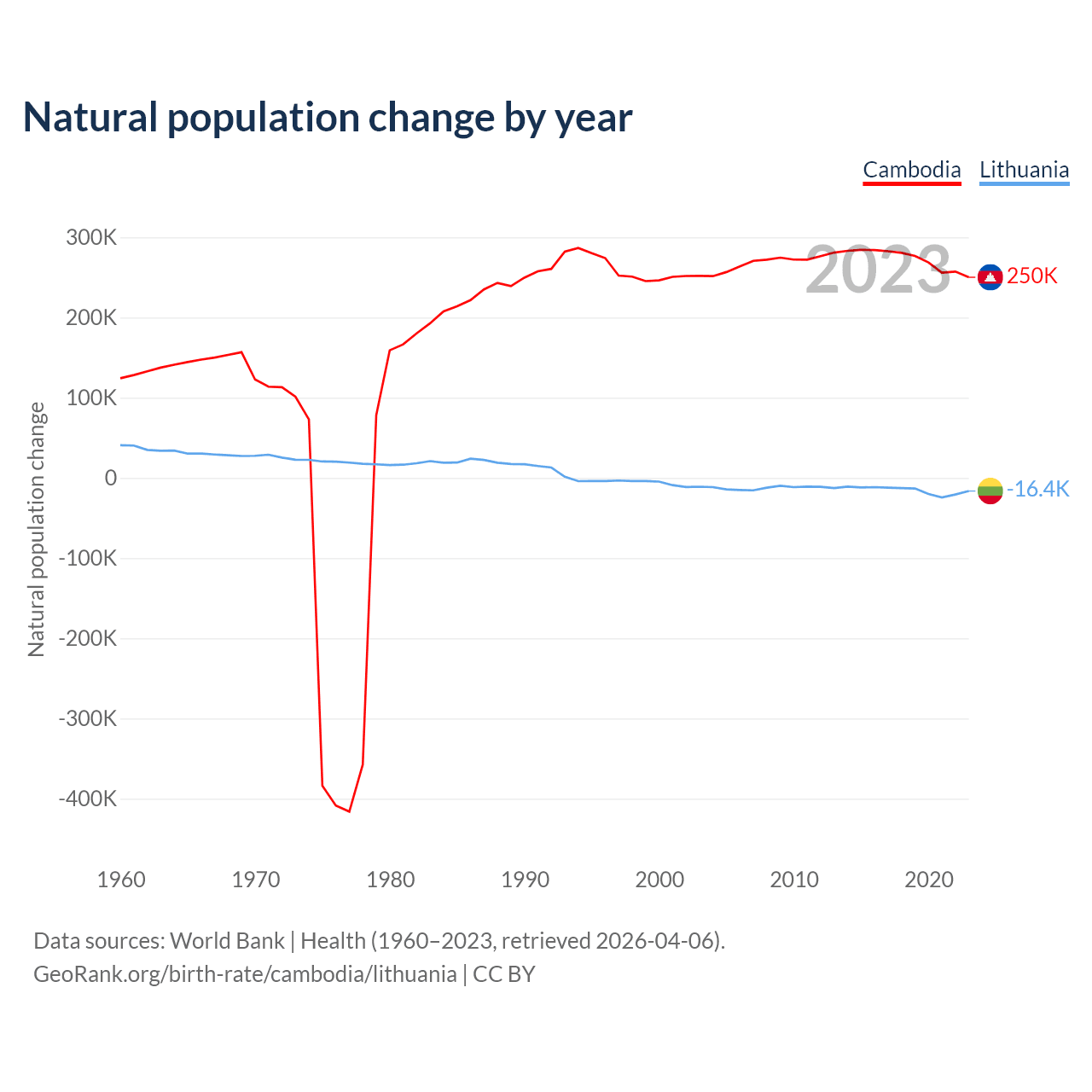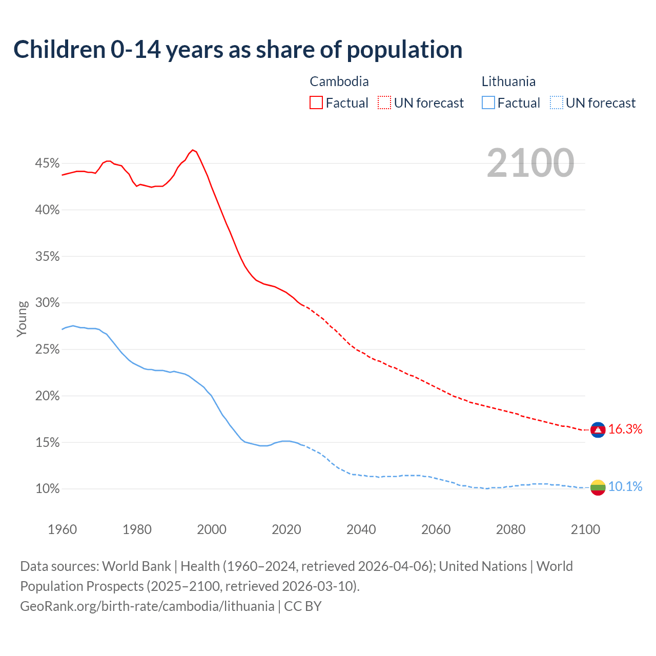According to the latest available data on birth rates, the fertility rate in Cambodia was 2.58 children per woman in 2023, compared to 1.18 in Lithuania in 2023. The replacement level is considered to be 2.1 children per woman.