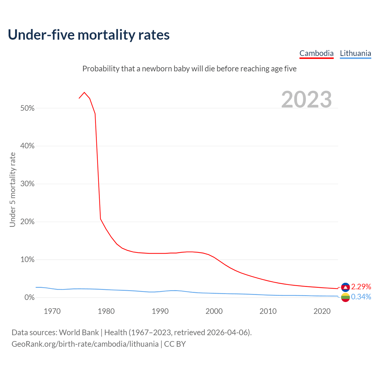 The chance that a newborn baby will die before reaching age five is 2.29% in Cambodia and 0.34% in Lithuania. Above is a chart with historical data on under-five mortality rates.