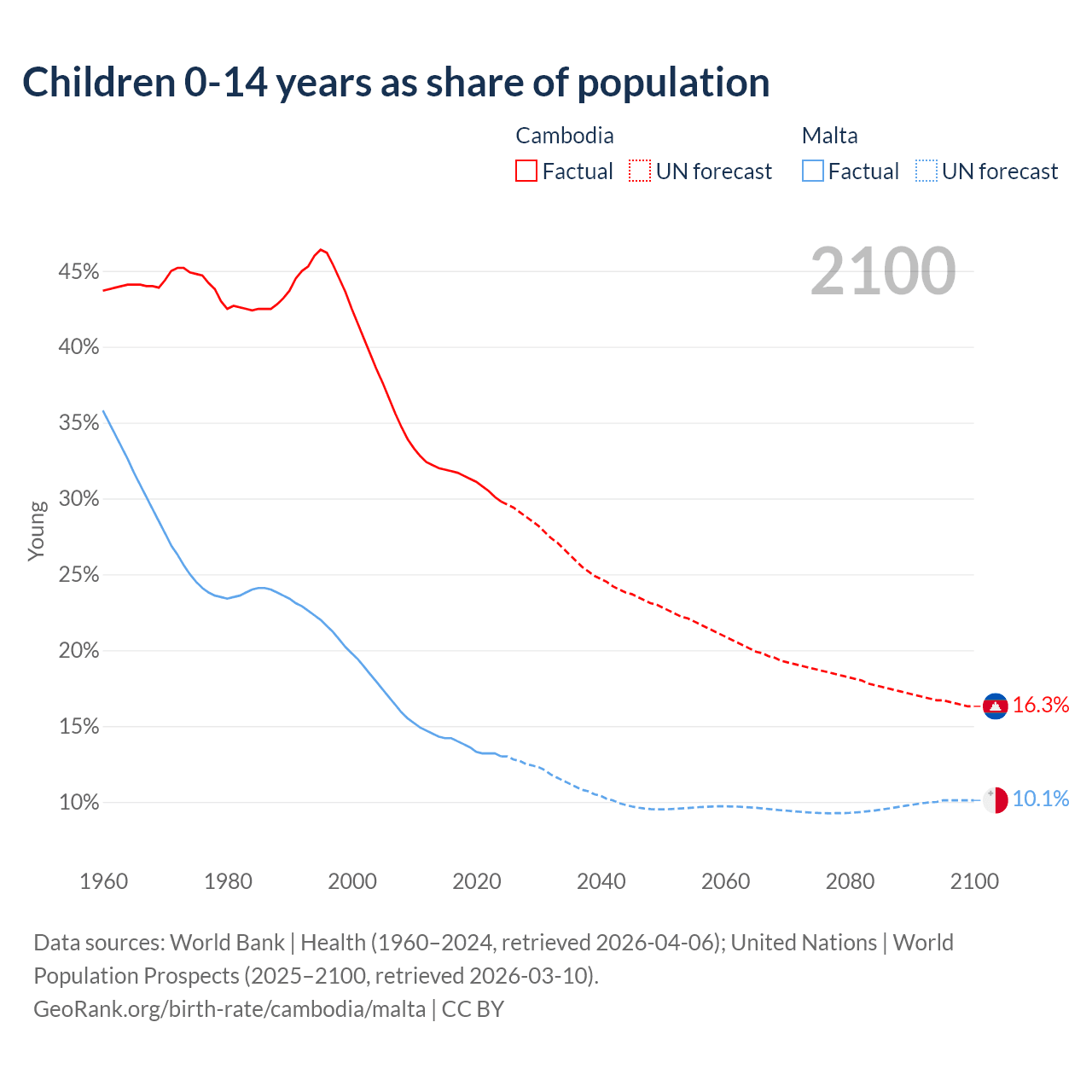 According to the latest available data on birth rates, the fertility rate in Cambodia was 2.58 children per woman in 2023, compared to 1.06 in Malta in 2023. The replacement level is considered to be 2.1 children per woman.