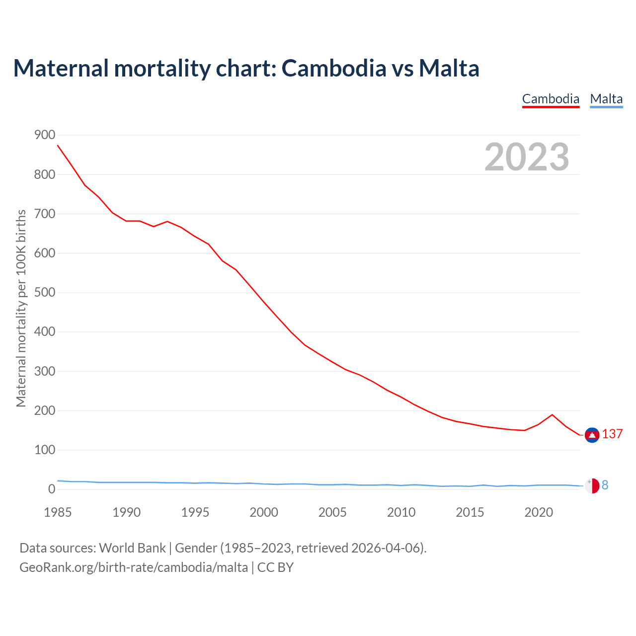 The maternal mortality rate, which is the probability of dying during childbirth or within 42 days of pregnancy termination, is 137 deaths per 100,000 live births in Cambodia, compared to 8 deaths in Malta.
