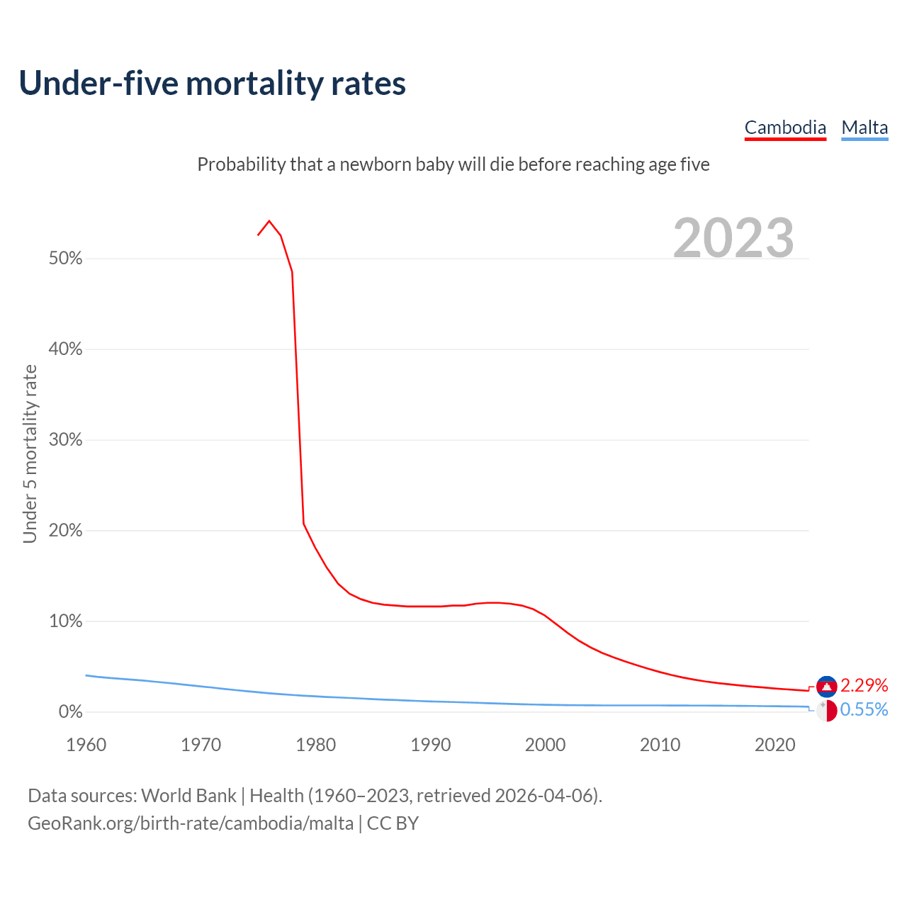 The chance that a newborn baby will die before reaching age five is 2.29% in Cambodia and 0.55% in Malta. Above is a chart with historical data on under-five mortality rates.