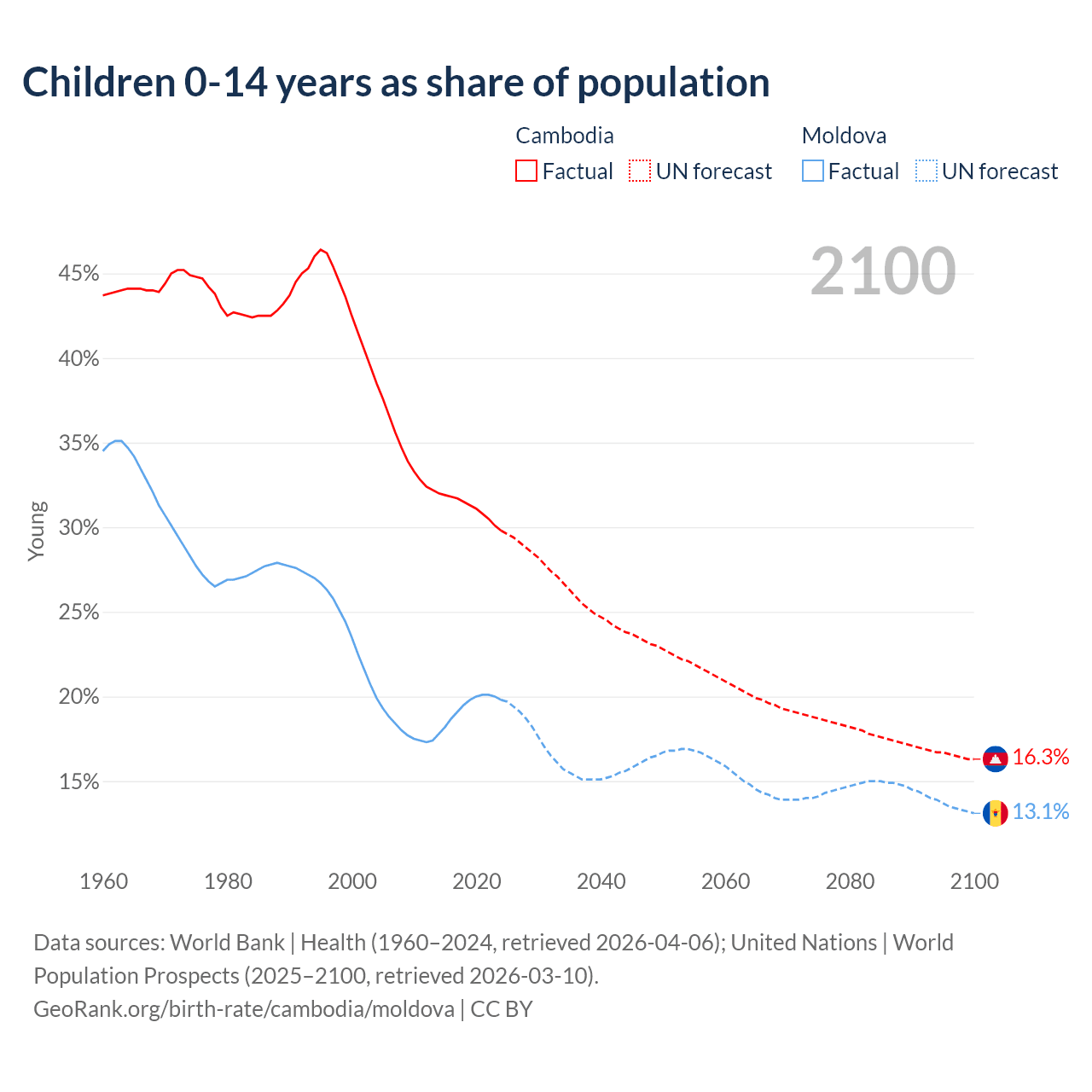 According to the latest available data on birth rates, the fertility rate in Cambodia was 2.58 children per woman in 2023, compared to 1.73 in Moldova in 2023. The replacement level is considered to be 2.1 children per woman.