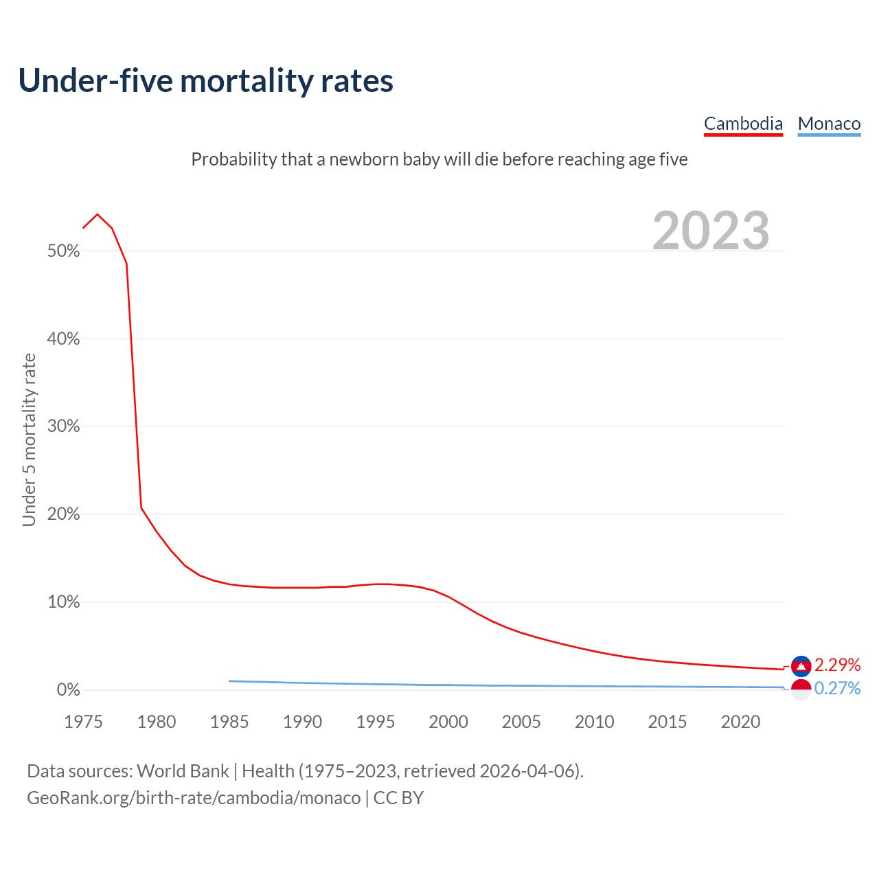 The chance that a newborn baby will die before reaching age five is 2.29% in Cambodia and 0.27% in Monaco. Above is a chart with historical data on under-five mortality rates.