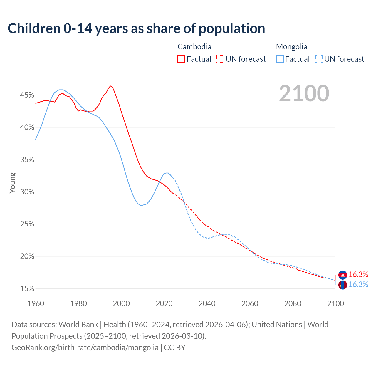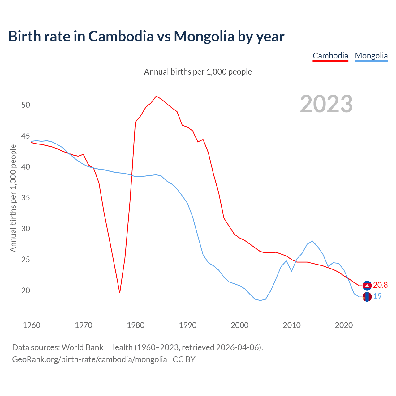According to the latest available data on birth rates, the fertility rate in Cambodia was 2.58 children per woman in 2023, compared to 2.7 in Mongolia in 2023. The replacement level is considered to be 2.1 children per woman.