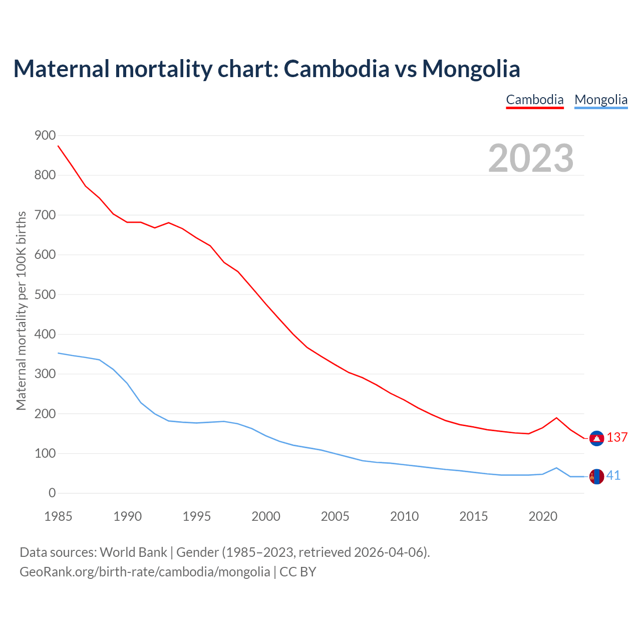 The maternal mortality rate, which is the probability of dying during childbirth or within 42 days of pregnancy termination, is 137 deaths per 100,000 live births in Cambodia, compared to 41 deaths in Mongolia.