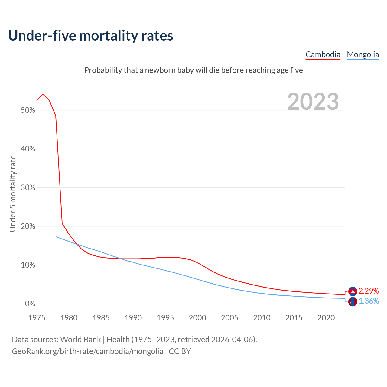 The chance that a newborn baby will die before reaching age five is 2.29% in Cambodia and 1.36% in Mongolia. Above is a chart with historical data on under-five mortality rates.