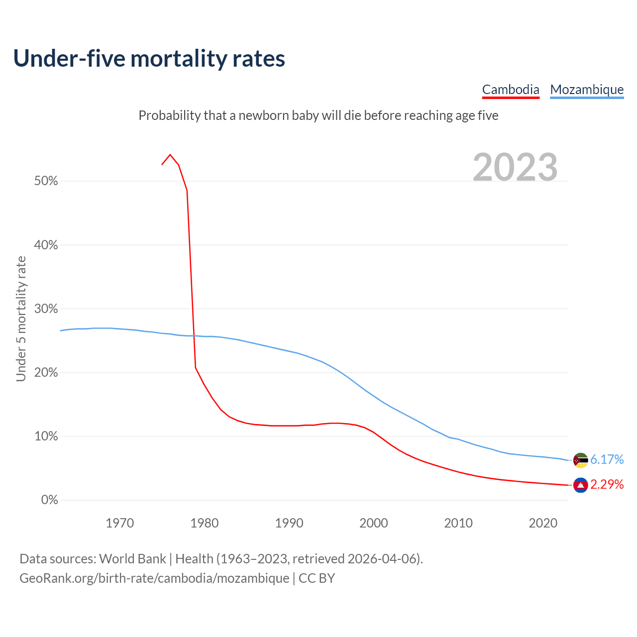 The chance that a newborn baby will die before reaching age five is 2.29% in Cambodia and 6.17% in Mozambique. Above is a chart with historical data on under-five mortality rates.