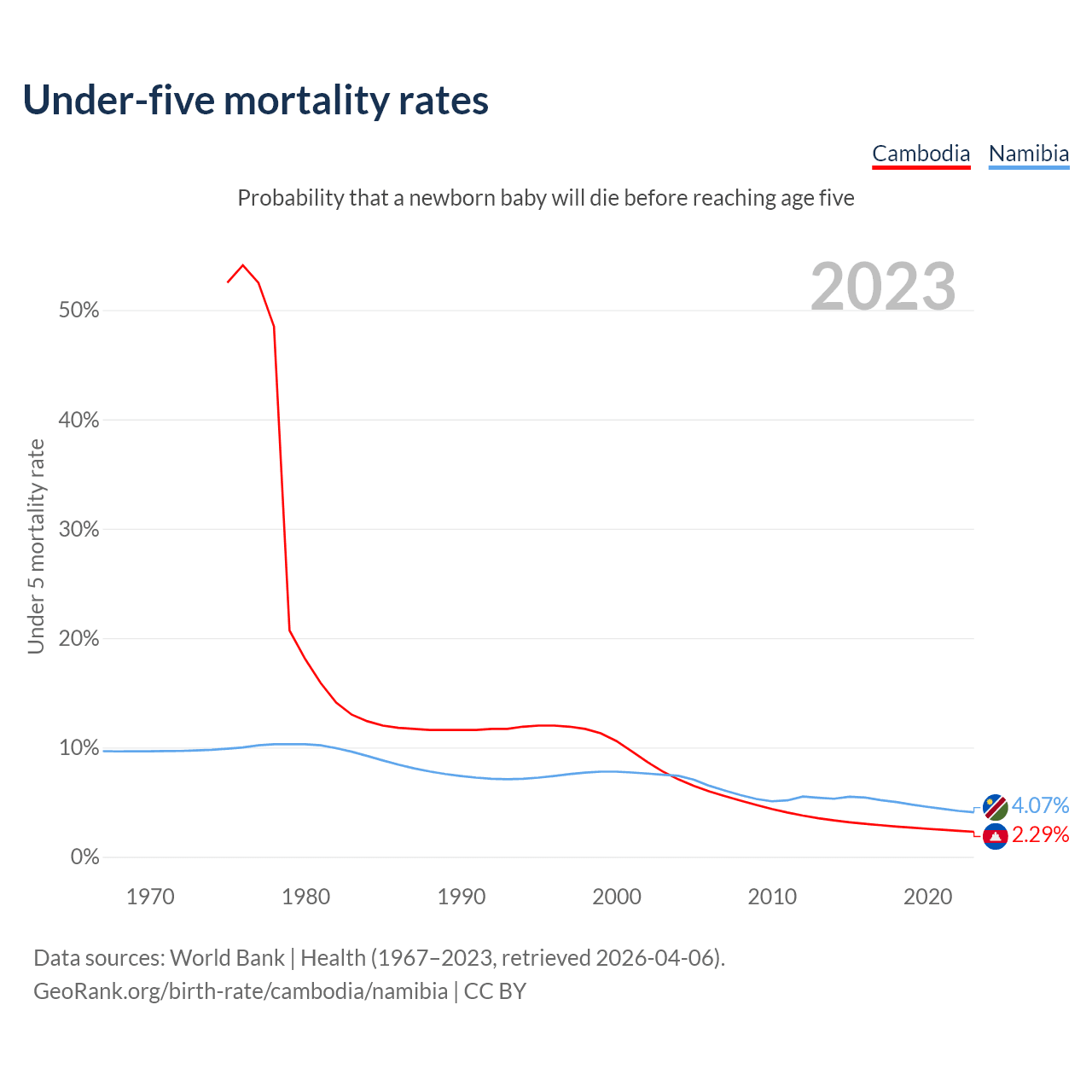 The chance that a newborn baby will die before reaching age five is 2.29% in Cambodia and 4.07% in Namibia. Above is a chart with historical data on under-five mortality rates.