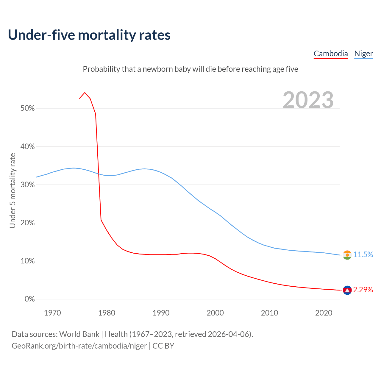 The chance that a newborn baby will die before reaching age five is 2.29% in Cambodia and 11.5% in Niger. Above is a chart with historical data on under-five mortality rates.