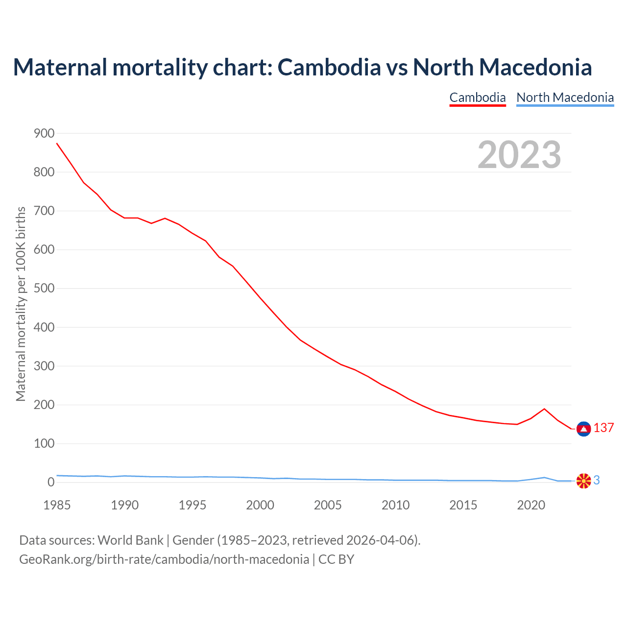 The maternal mortality rate, which is the probability of dying during childbirth or within 42 days of pregnancy termination, is 137 deaths per 100,000 live births in Cambodia, compared to 3 deaths in North Macedonia.