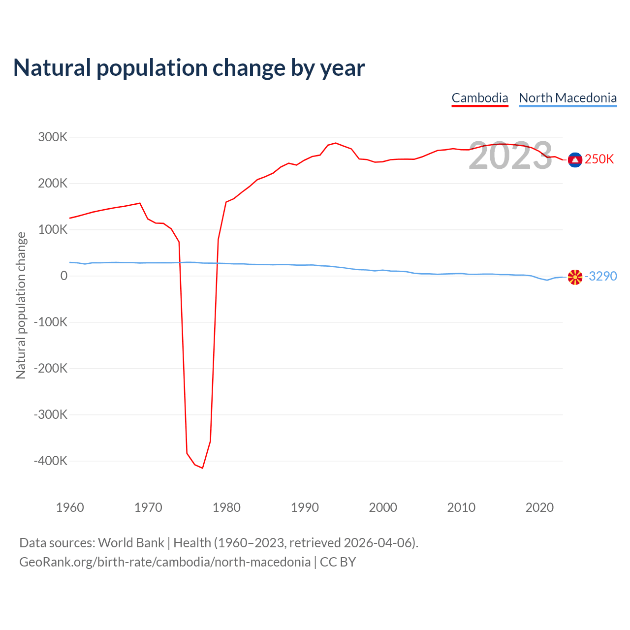 - Cambodia is ranked 71/196 by birth rate compared to 158/196 for North Macedonia.
