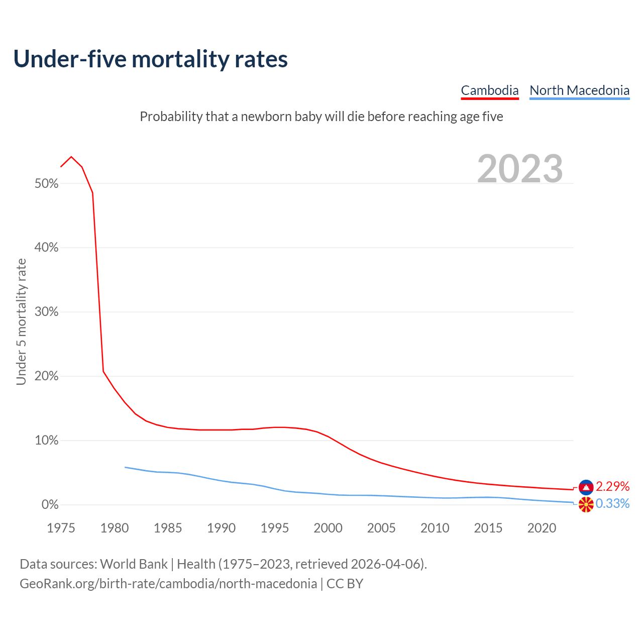 The chance that a newborn baby will die before reaching age five is 2.29% in Cambodia and 0.33% in North Macedonia. Above is a chart with historical data on under-five mortality rates.
