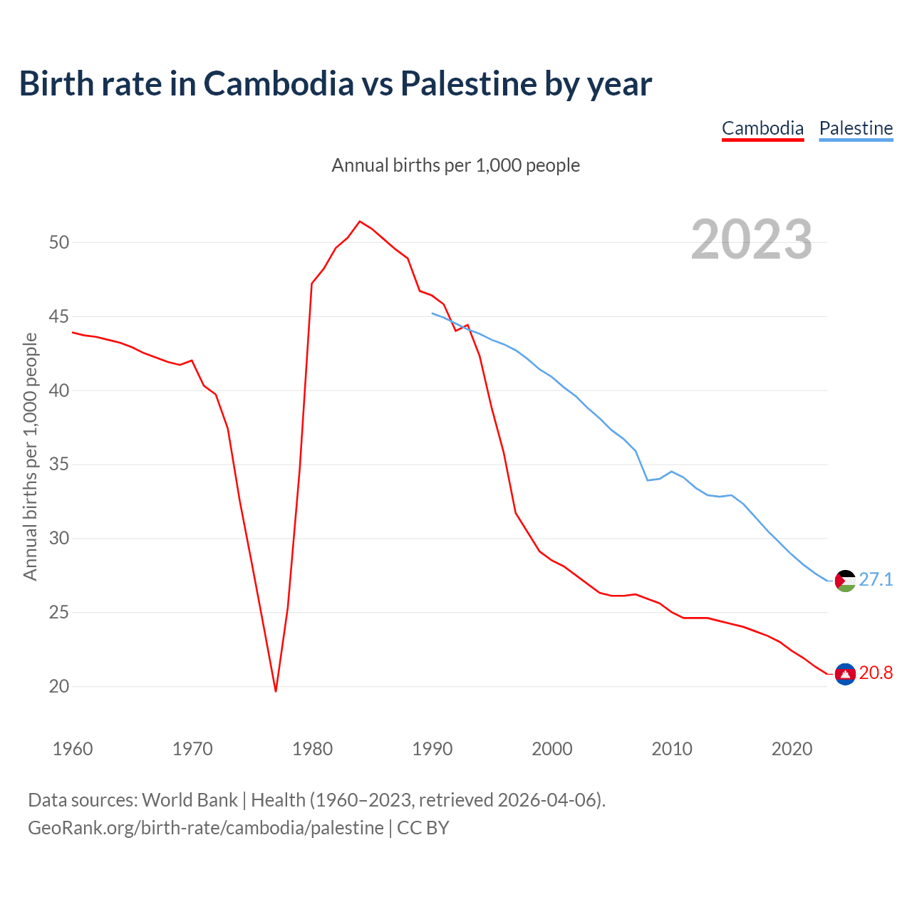 According to the latest available data on birth rates, the fertility rate in Cambodia was 2.58 children per woman in 2023, compared to 3.31 in Palestine in 2023. The replacement level is considered to be 2.1 children per woman.