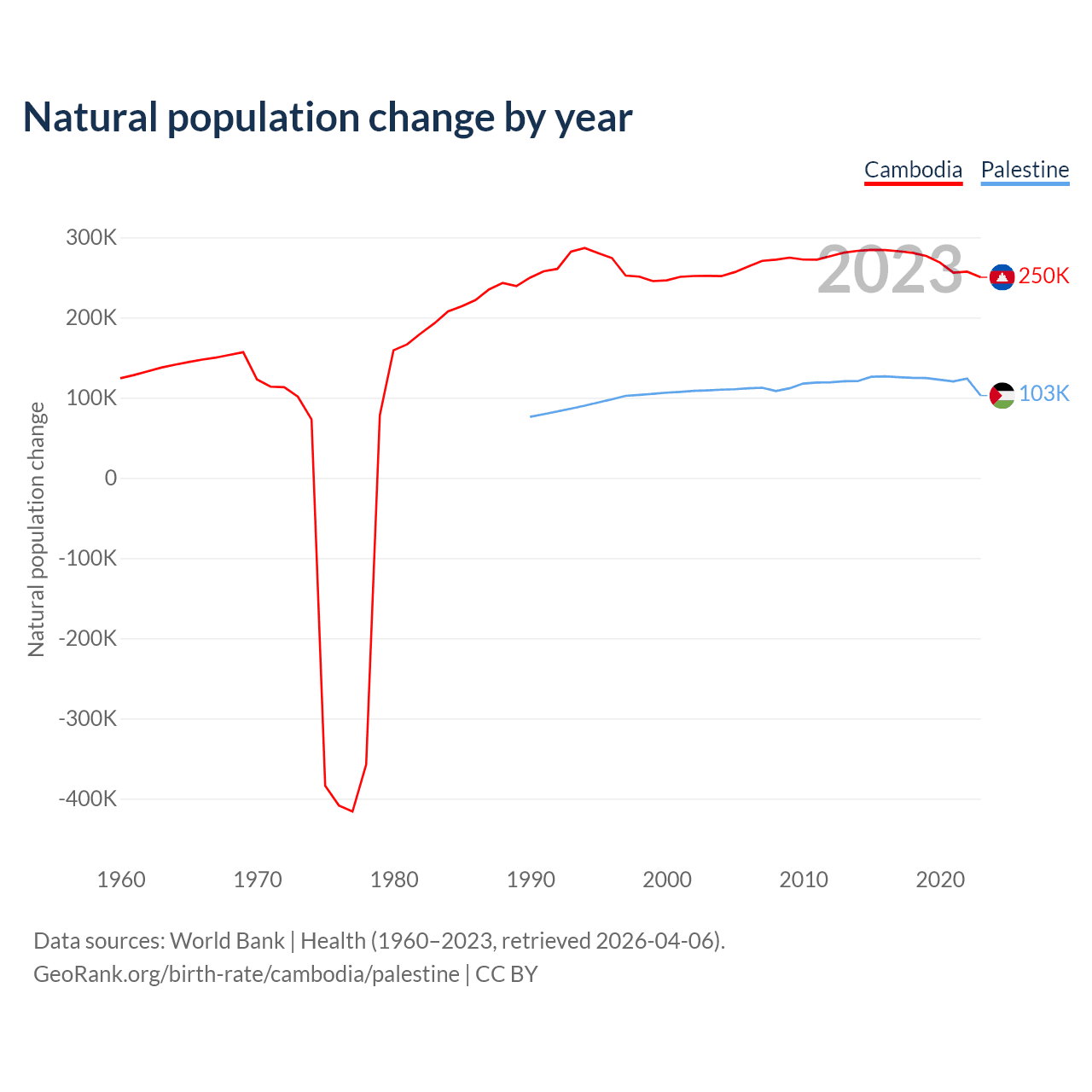 - Cambodia is ranked 71/196 by birth rate compared to 44/196 for Palestine.