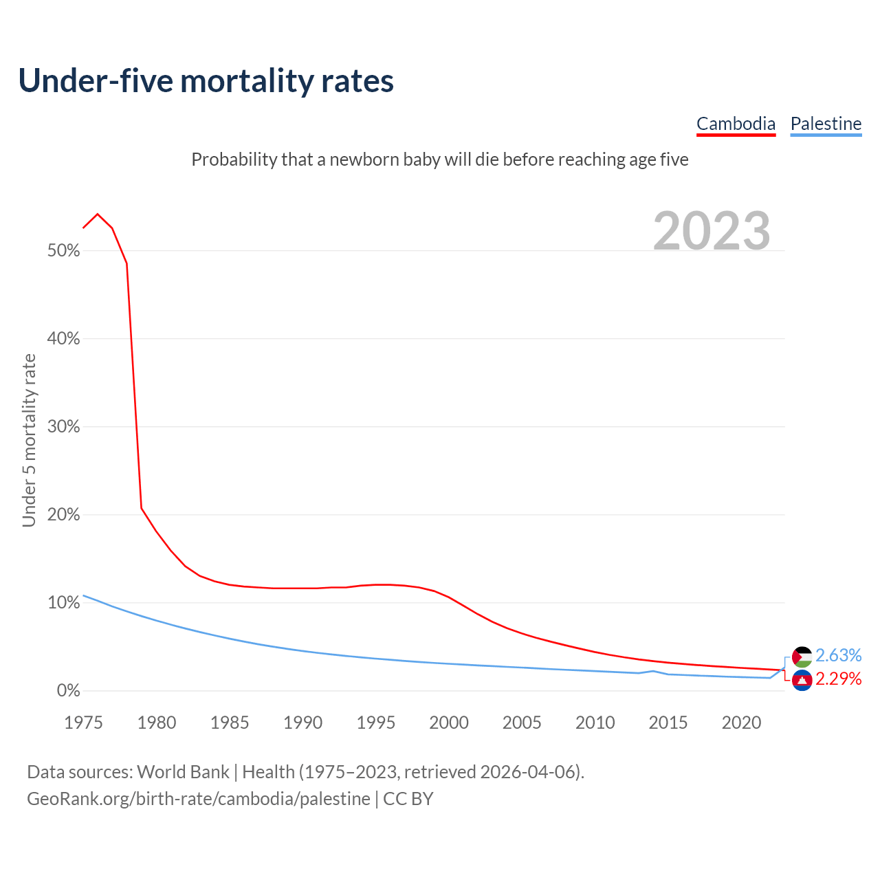The chance that a newborn baby will die before reaching age five is 2.29% in Cambodia and 2.63% in Palestine. Above is a chart with historical data on under-five mortality rates.