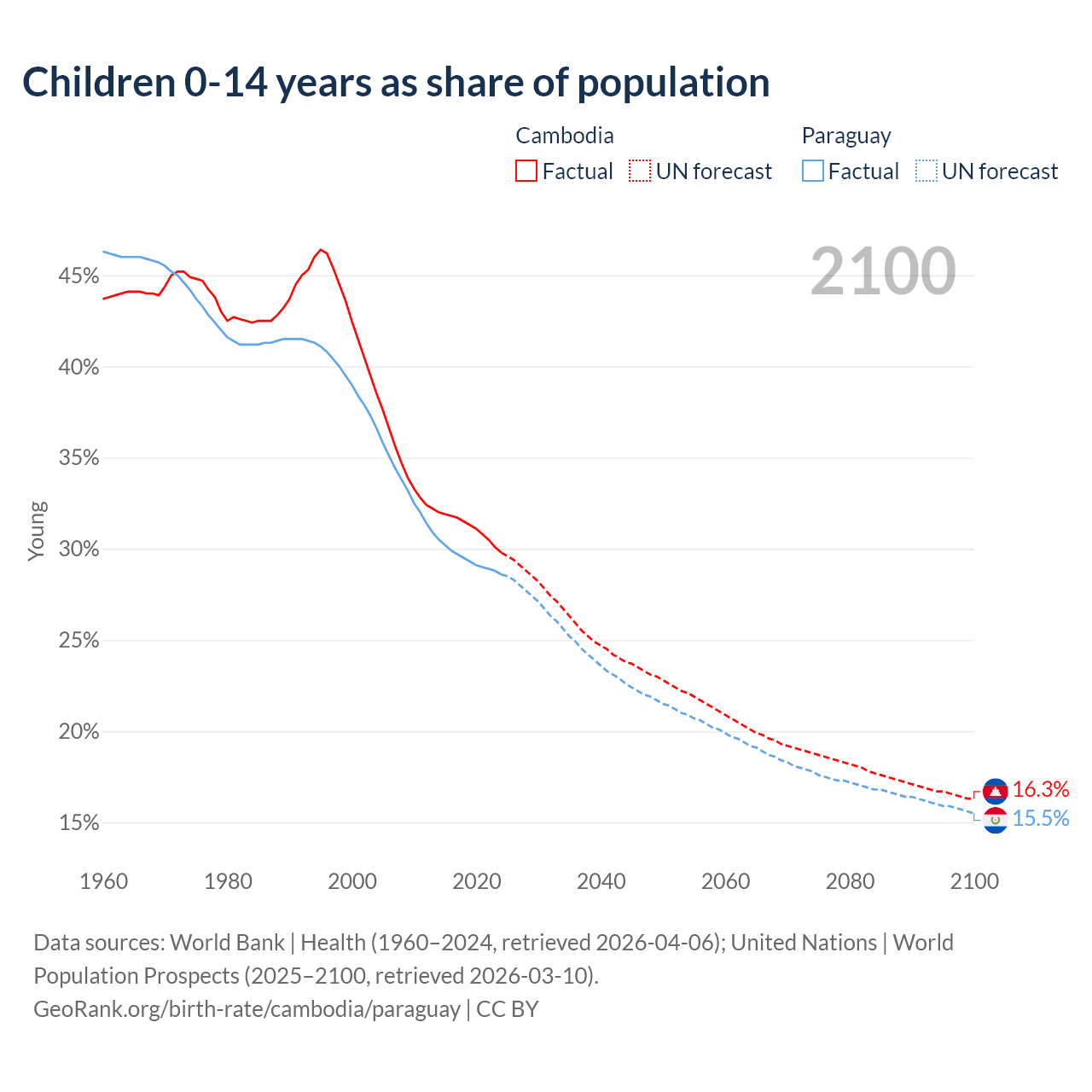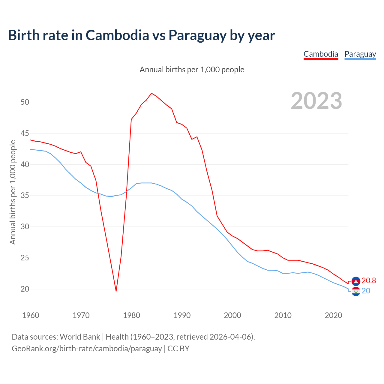 According to the latest available data on birth rates, the fertility rate in Cambodia was 2.58 children per woman in 2023, compared to 2.42 in Paraguay in 2023. The replacement level is considered to be 2.1 children per woman.