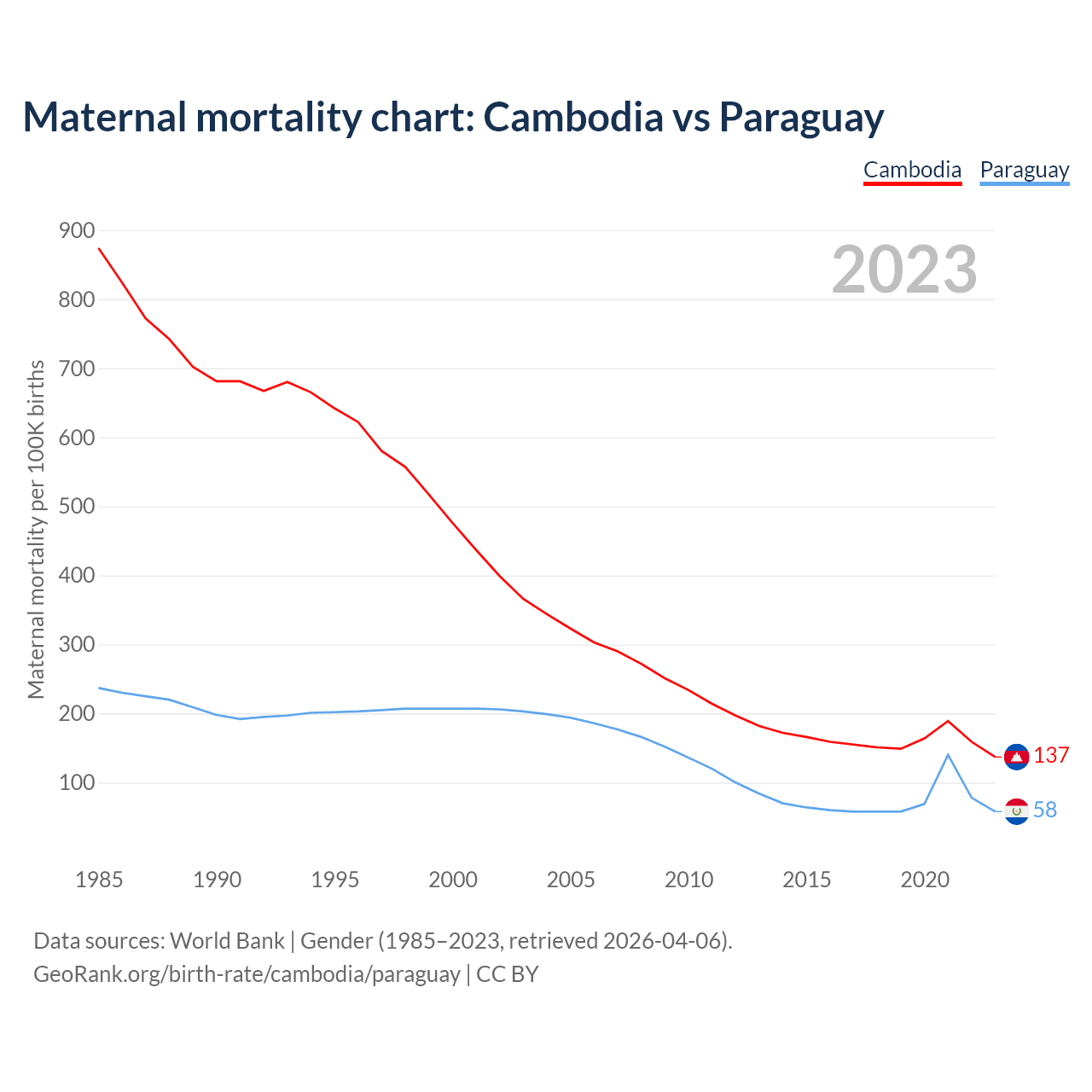 The maternal mortality rate, which is the probability of dying during childbirth or within 42 days of pregnancy termination, is 137 deaths per 100,000 live births in Cambodia, compared to 58 deaths in Paraguay.
