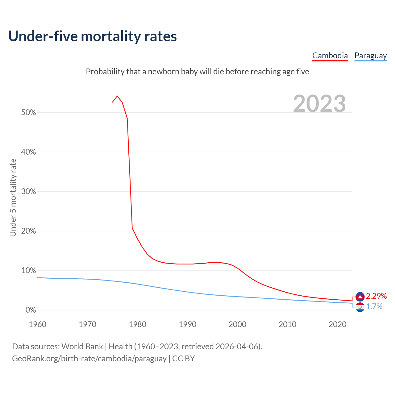 The chance that a newborn baby will die before reaching age five is 2.29% in Cambodia and 1.7% in Paraguay. Above is a chart with historical data on under-five mortality rates.