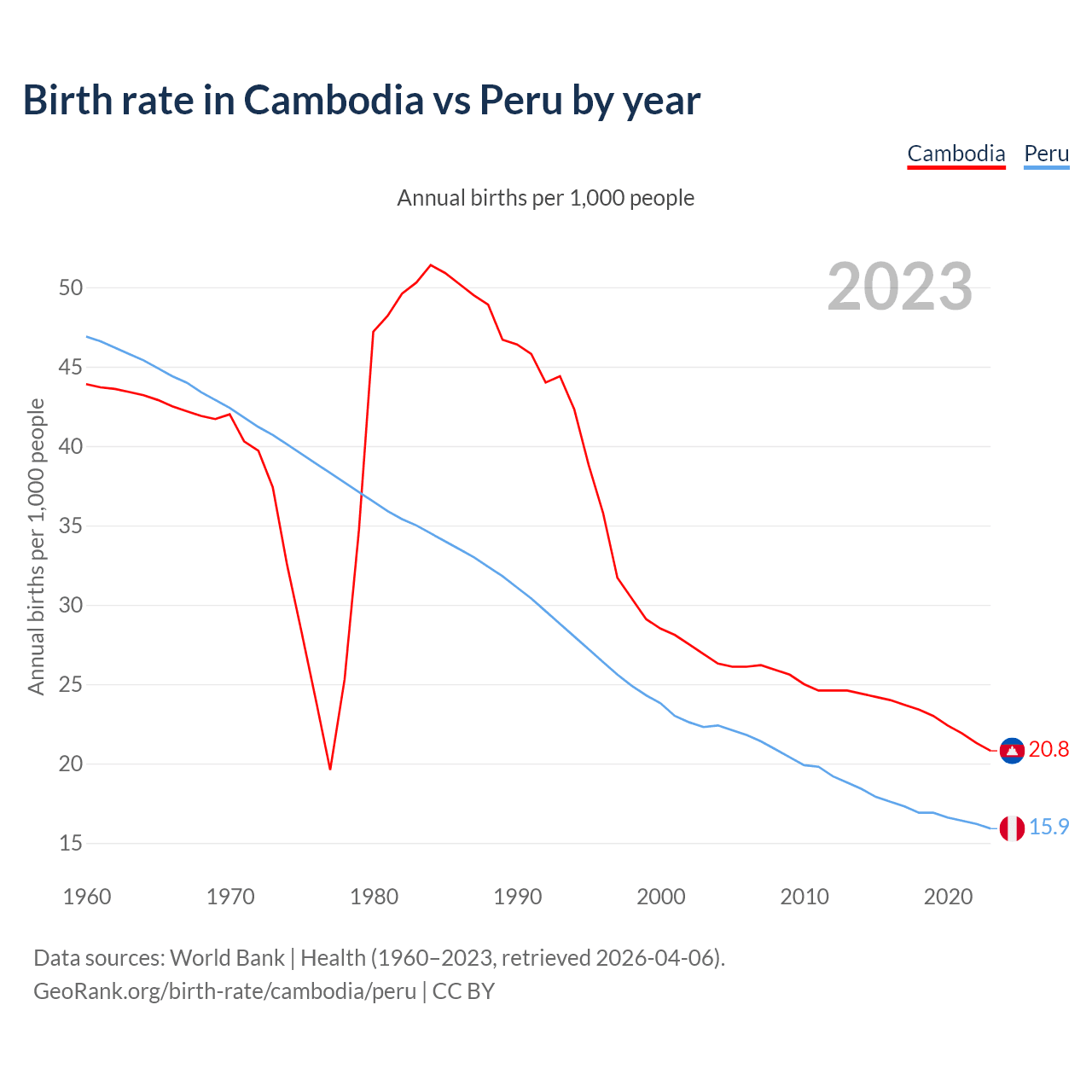 Cambodia has an annual birth rate of 20.8 births per 1,000 people, compared to 15.9 for Peru. The average number of children a woman is expected to have during her lifetime — the fertility rate, is 2.58 in Cambodia and 1.98 in Peru — 23.2% difference.
